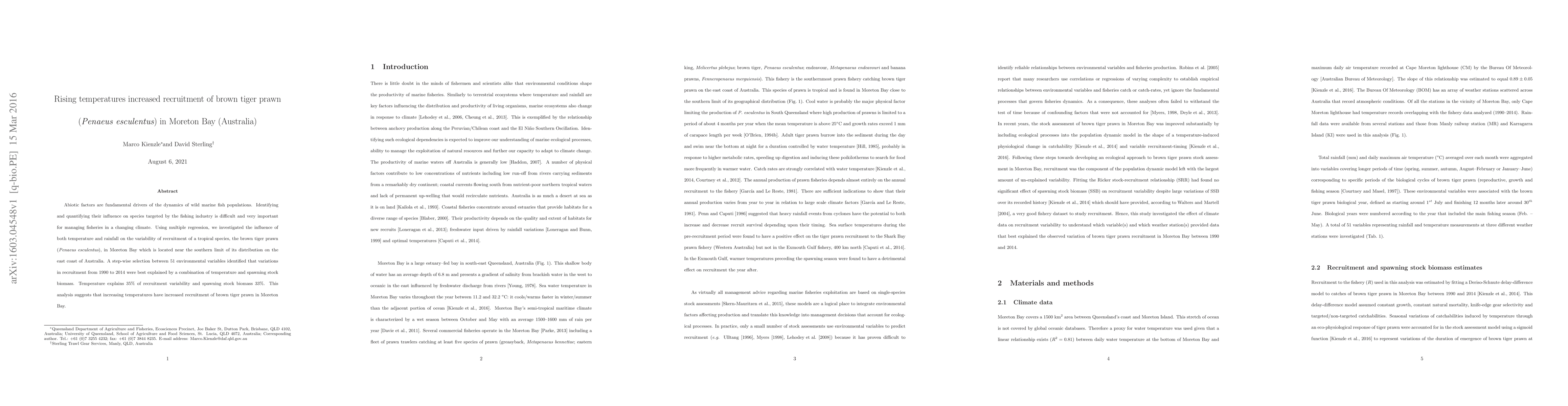 Rising temperatures significantly enhance the recruitment of brown tiger prawns (Penaeus esculentus) in Moreton Bay, Australia, according to a study that combines temperature and spawning stock biomass as key factors influencing recruitment variability. The research highlights the importance of climate change impacts on fisheries management.