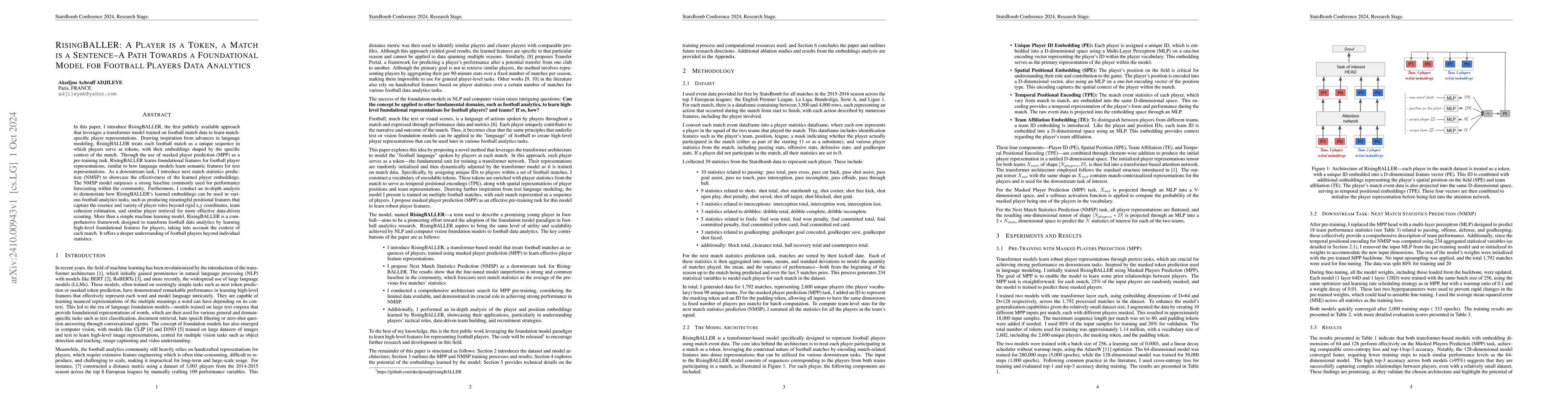 RisingBALLER employs transformer models to analyze football match data, treating matches as unique sequences where players serve as tokens. This approach learns match-specific player representations and uses next match statistics prediction to validate its effectiveness, offering deeper insights into player roles and team dynamics beyond basic statistics.