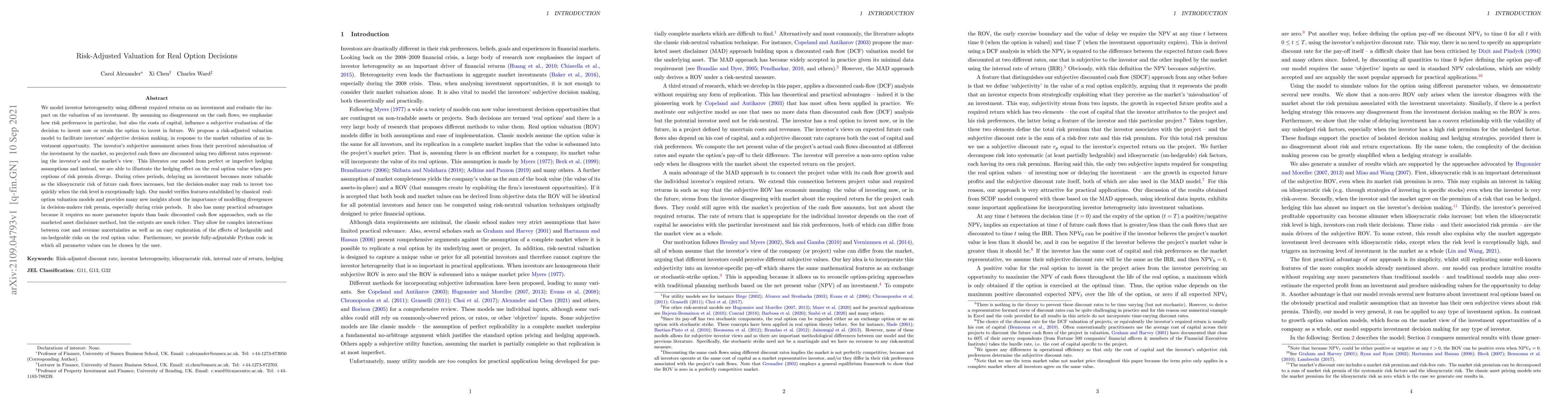 We model investor heterogeneity using different required returns on an investment and evaluate the impact on the valuation of an investment. By assuming no disagreement on the cash flows, we emphasize how risk preferences in particular, but also the costs of capital, influence a subjective evaluation of the decision to invest now or retain the option to invest in future. We propose a risk-adjusted valuation model to facilitate investors' subjective decision making, in response to the market valuation of an investment opportunity. The investor's subjective assessment arises from their perceived misvaluation of the investment by the market, so projected cash flows are discounted using two different rates representing the investor's and the market's view. This liberates our model from perfect or imperfect hedging assumptions and instead, we are able to illustrate the hedging effect on the real option value when perceptions of risk premia diverge. During crises periods, delaying an investment becomes more valuable as the idiosyncratic risk of future cash flows increases, but the decision-maker may rush to invest too quickly when the risk level is exceptionally high. Our model verifies features established by classical real-option valuation models and provides many new insights about the importance of modelling divergences in decision-makers risk premia, especially during crisis periods. It also has many practical advantages because it requires no more parameter inputs than basic discounted cash flow approaches, such as the marketed asset disclaimer method, but the outputs are much richer. They allow for complex interactions between cost and revenue uncertainties as well as an easy exploration of the effects of hedgeable and un-hedgeable risks on the real option value. Furthermore, we provide fully-adjustable Python code in which all parameter values can be chosen by the user.