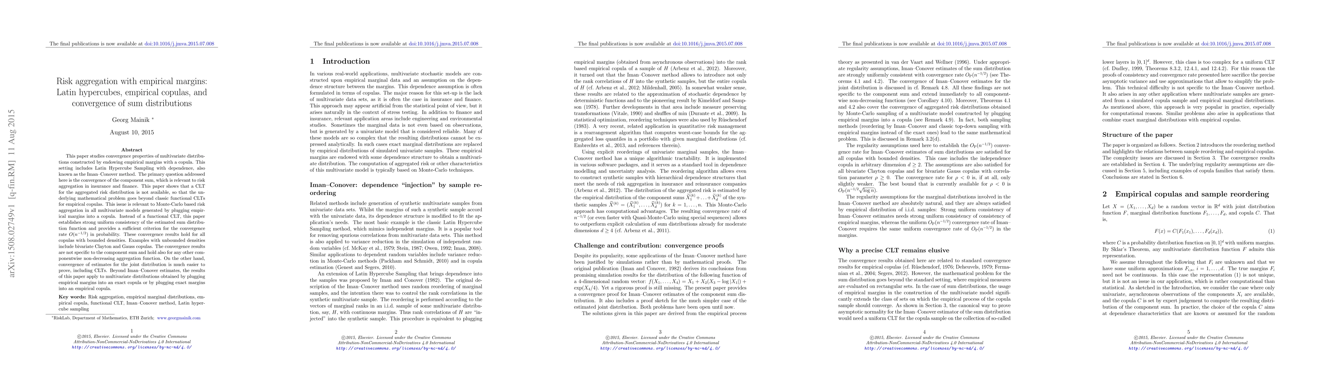 This paper studies convergence properties of multivariate distributions constructed by endowing empirical margins with a copula. This setting includes Latin Hypercube Sampling with dependence, also known as the Iman--Conover method. The primary question addressed here is the convergence of the component sum, which is relevant to risk aggregation in insurance and finance. This paper shows that a CLT for the aggregated risk distribution is not available, so that the underlying mathematical problem goes beyond classic functional CLTs for empirical copulas. This issue is relevant to Monte-Carlo based risk aggregation in all multivariate models generated by plugging empirical margins into a copula. Instead of a functional CLT, this paper establishes strong uniform consistency of the estimated sum distribution function and provides a sufficient criterion for the convergence rate $O(n^{-1/2})$ in probability. These convergence results hold for all copulas with bounded densities. Examples with unbounded densities include bivariate Clayton and Gauss copulas. The convergence results are not specific to the component sum and hold also for any other componentwise non-decreasing aggregation function. On the other hand, convergence of estimates for the joint distribution is much easier to prove, including CLTs. Beyond Iman--Conover estimates, the results of this paper apply to multivariate distributions obtained by plugging empirical margins into an exact copula or by plugging exact margins into an empirical copula.