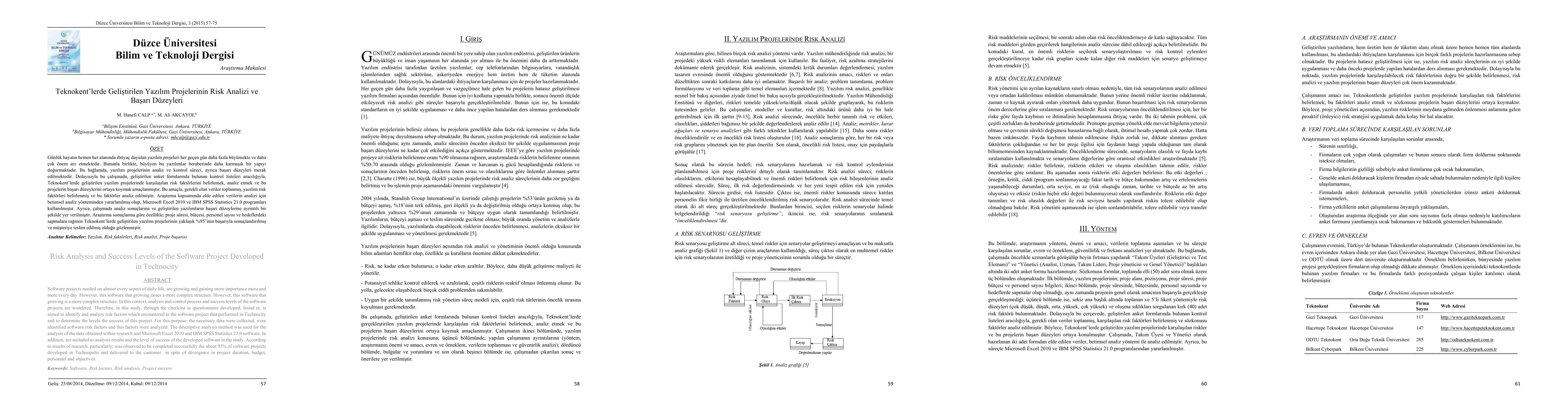 Software projects needed on almost every aspect of daily life, are growing and gaining more importance more and more every day. However, this software that growing raises a more complex structure. However, this software that growing is a more complex structure. In this context, analysis and control process and success levels of the software projects are wondered. Therefore, in this study, through the checklist in questionnaire developed, found in, is aimed to identify and analyze risk factors which encountered in the software project that performed in Technocity and to determine the levels the success of this project. For this purpose, the necessary data were collected, were identified software risk factors and this factors were analyzed. The descriptive analysis method was used for the analysis of the data obtained within research and Microsoft Excel 2010 and IBM SPSS Statistics 21.0 software. In addition, are included to analysis results and the level of success of the developed software in the study. According to results of research, particularly; was observed to be completed successfully the about 95% of software projects developed in Technopolis and delivered to the customer in spite of divergence in project duration, budget, personnel and objectives.