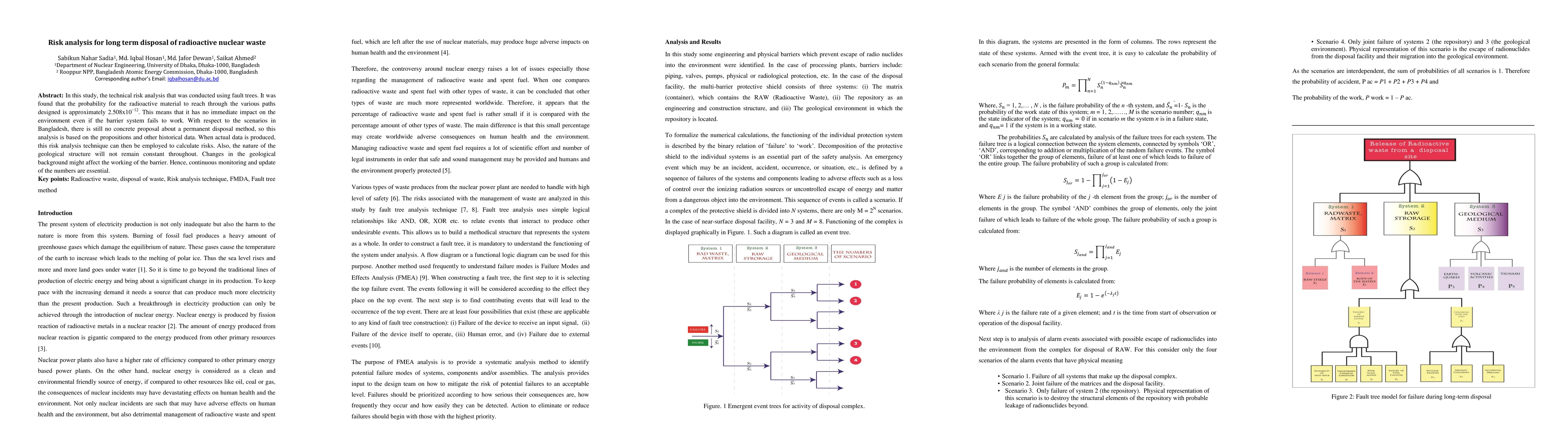 In this study the technical risk analysis that was conducted using fault trees.With respect to the scenarios in Bangladesh, there is still no concrete proposal about a permanent disposal method, so this analysis is based on the propositions and other historical data. When actual data is produced, this risk analysis technique can then be employed to calculate risks.