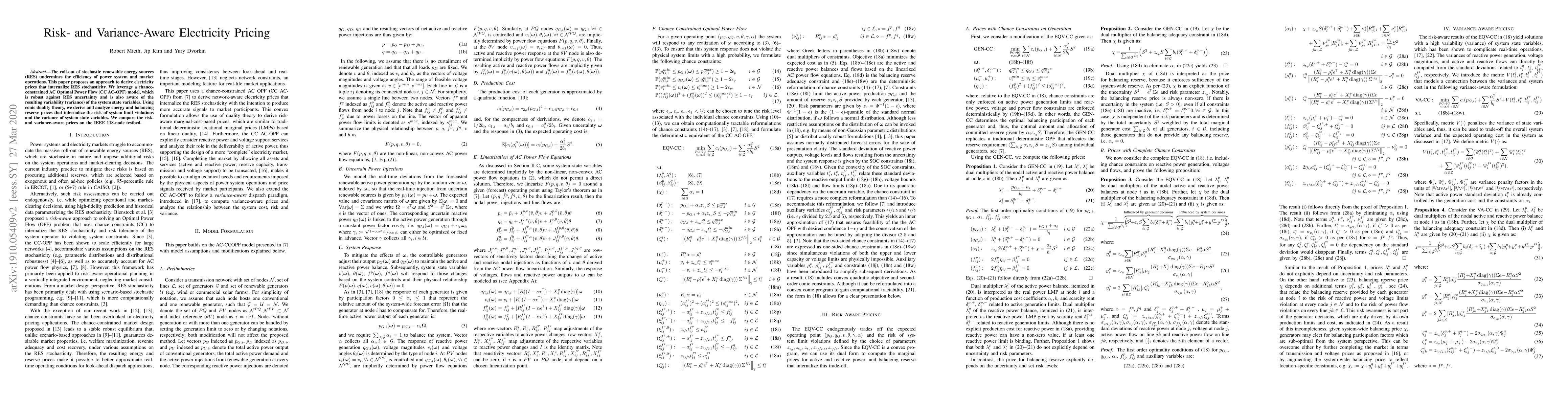This paper proposes a method to derive electricity prices that account for the stochastic nature of renewable energy sources, using a chance-constrained AC Optimal Power Flow model. It analyzes energy and balancing reserve prices that consider both system limit risks and variance, and tests the approach on the IEEE 118-node testbed.