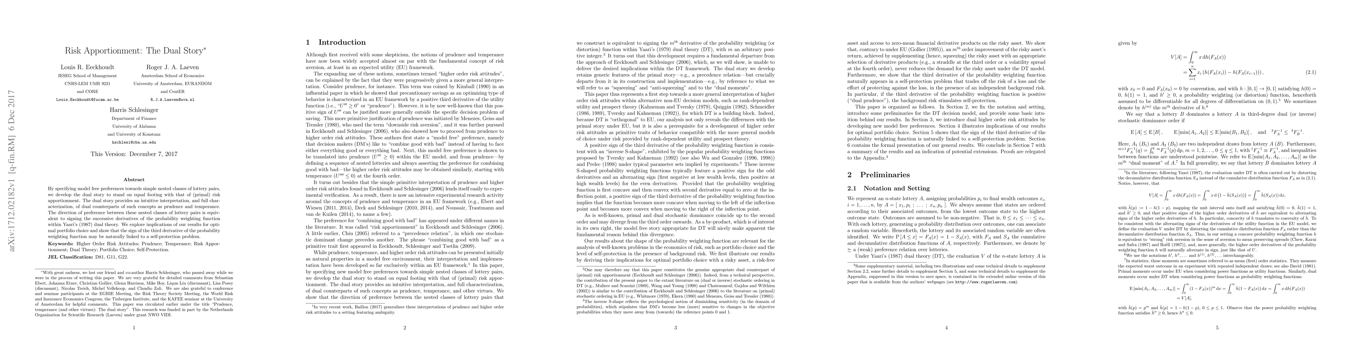 This paper presents a dual perspective on risk apportionment, providing an intuitive interpretation and full characterization of concepts like prudence and temperance. It links preferences between nested lottery pairs to the successive derivatives of the probability weighting function, with implications for optimal portfolio choice and self-protection strategies.