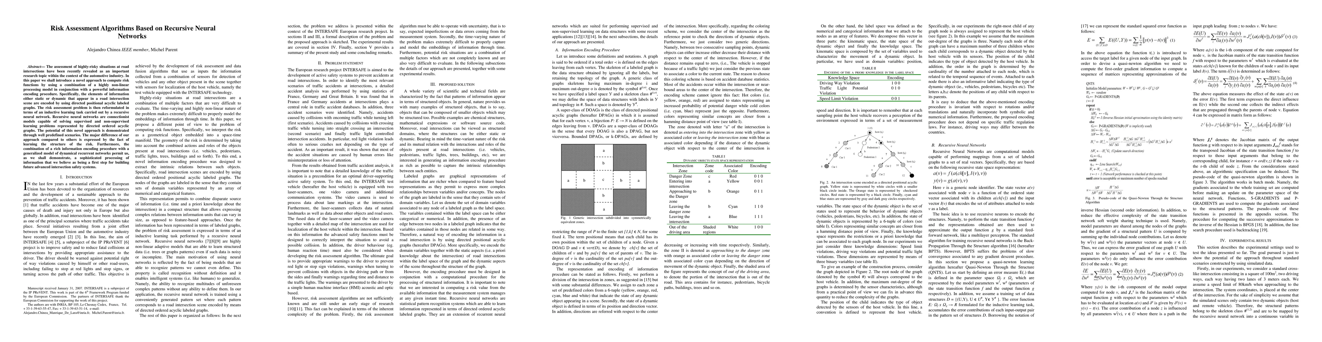 The assessment of highly-risky situations at road intersections have been recently revealed as an important research topic within the context of the automotive industry. In this paper we shall introduce a novel approach to compute risk functions by using a combination of a highly non-linear processing model in conjunction with a powerful information encoding procedure. Specifically, the elements of information either static or dynamic that appear in a road intersection scene are encoded by using directed positional acyclic labeled graphs. The risk assessment problem is then reformulated in terms of an inductive learning task carried out by a recursive neural network. Recursive neural networks are connectionist models capable of solving supervised and non-supervised learning problems represented by directed ordered acyclic graphs. The potential of this novel approach is demonstrated through well predefined scenarios. The major difference of our approach compared to others is expressed by the fact of learning the structure of the risk. Furthermore, the combination of a rich information encoding procedure with a generalized model of dynamical recurrent networks permit us, as we shall demonstrate, a sophisticated processing of information that we believe as being a first step for building future advanced intersection safety systems