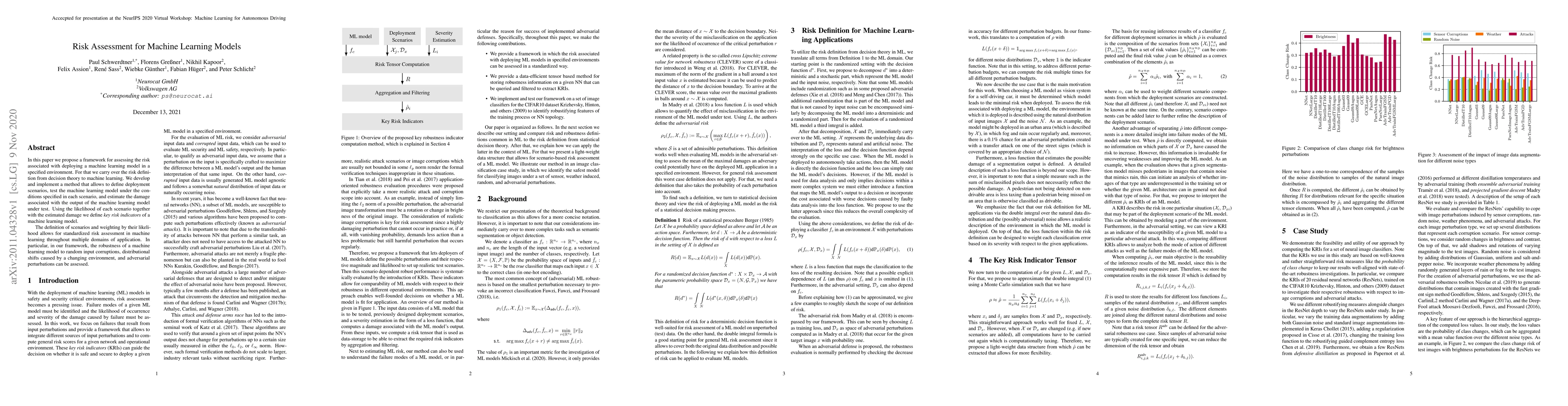 In this paper we propose a framework for assessing the risk associated with deploying a machine learning model in a specified environment. For that we carry over the risk definition from decision theory to machine learning. We develop and implement a method that allows to define deployment scenarios, test the machine learning model under the conditions specified in each scenario, and estimate the damage associated with the output of the machine learning model under test. Using the likelihood of each scenario together with the estimated damage we define \emph{key risk indicators} of a machine learning model. The definition of scenarios and weighting by their likelihood allows for standardized risk assessment in machine learning throughout multiple domains of application. In particular, in our framework, the robustness of a machine learning model to random input corruptions, distributional shifts caused by a changing environment, and adversarial perturbations can be assessed.