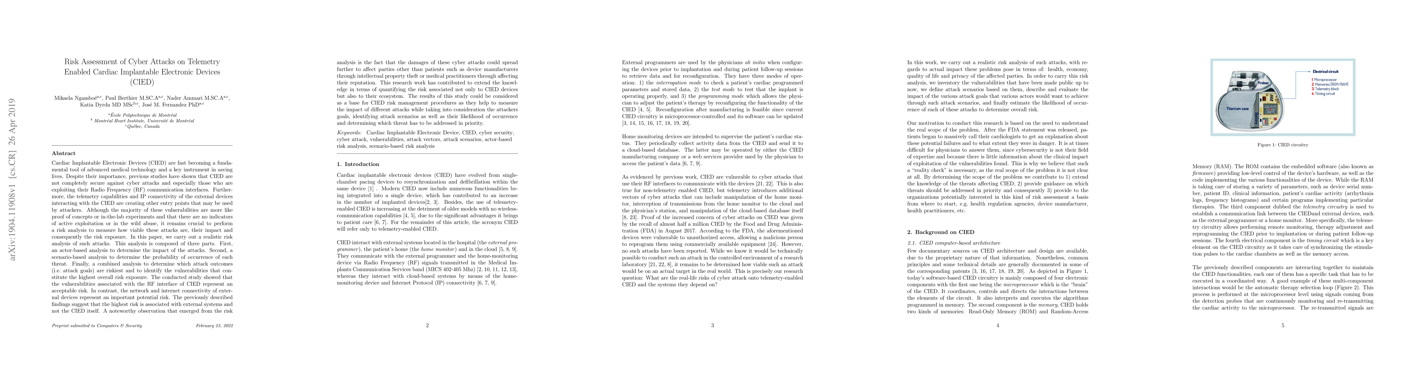 This paper conducts a risk assessment of cyber attacks on telemetry-enabled cardiac implantable electronic devices (CIED), identifying vulnerabilities in their RF communication interfaces and the internet connectivity of external devices. The study concludes that while the RF interface poses an acceptable risk, the external devices' connectivity represents a significant potential threat, indicating the highest risk lies with external systems.