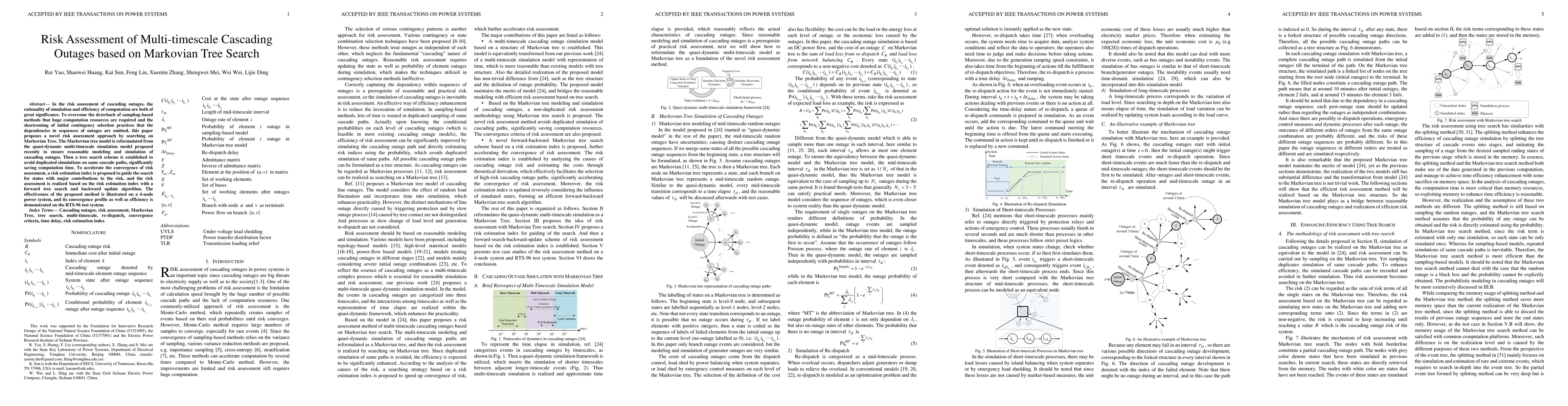 This paper proposes a novel risk assessment method for multi-timescale cascading outages using a Markovian tree search to enhance simulation rationality and computational efficiency. The method reformulates a quasi-dynamic model and employs a tree search scheme to avoid redundant simulations, significantly reducing computation time.