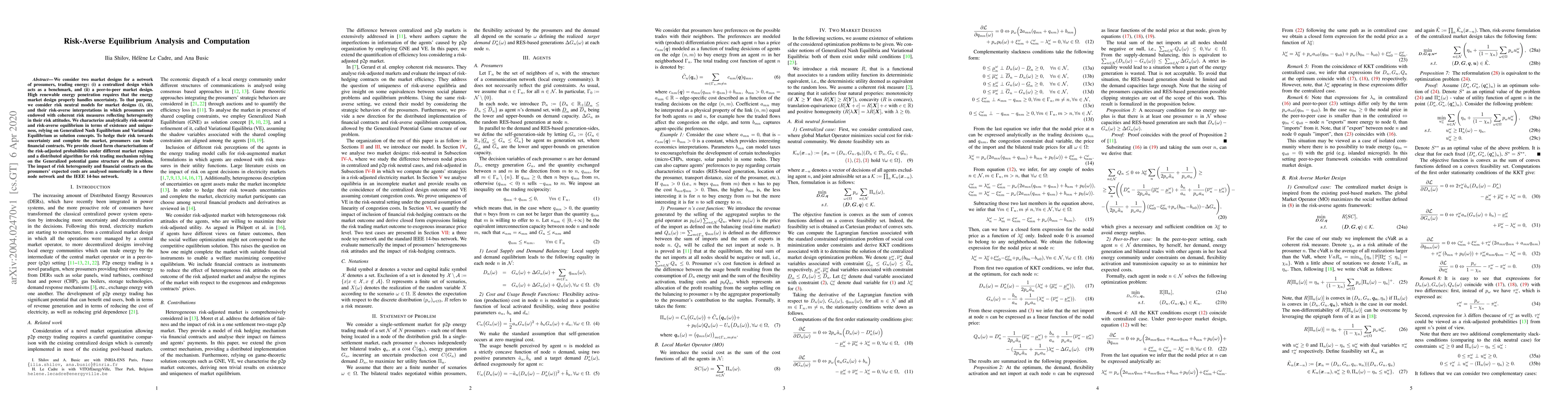 This paper analyzes two market designs for energy trading among prosumers, comparing centralized and peer-to-peer models, and explores the impact of risk-averse behaviors. It characterizes risk-neutral and risk-averse equilibria using Generalized Nash Equilibrium and Variational Equilibrium, and provides a distributed algorithm for risk trading mechanisms.