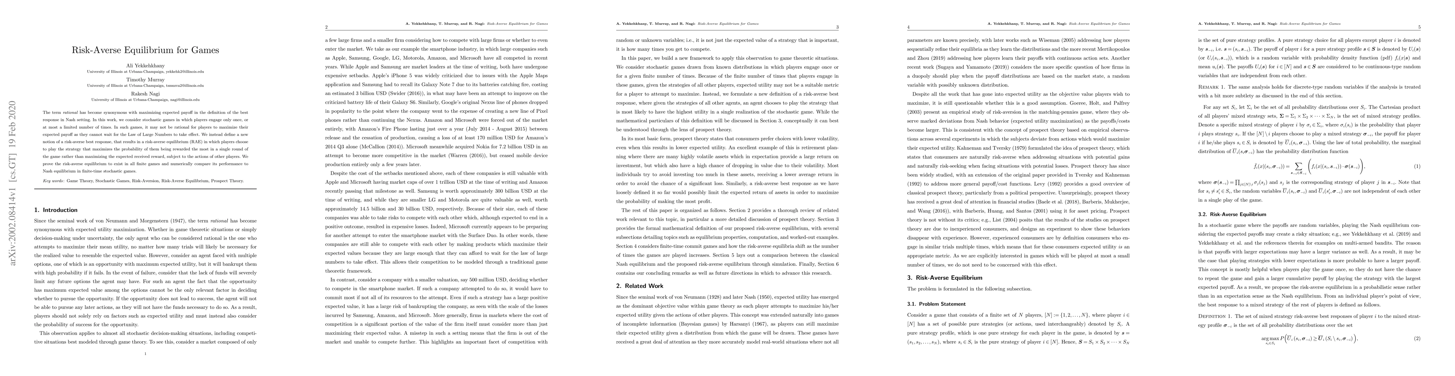 The term rational has become synonymous with maximizing expected payoff in the definition of the best response in Nash setting. In this work, we consider stochastic games in which players engage only once, or at most a limited number of times. In such games, it may not be rational for players to maximize their expected payoff as they cannot wait for the Law of Large Numbers to take effect. We instead define a new notion of a risk-averse best response, that results in a risk-averse equilibrium (RAE) in which players choose to play the strategy that maximizes the probability of them being rewarded the most in a single round of the game rather than maximizing the expected received reward, subject to the actions of other players. We prove the risk-averse equilibrium to exist in all finite games and numerically compare its performance to Nash equilibrium in finite-time stochastic games.