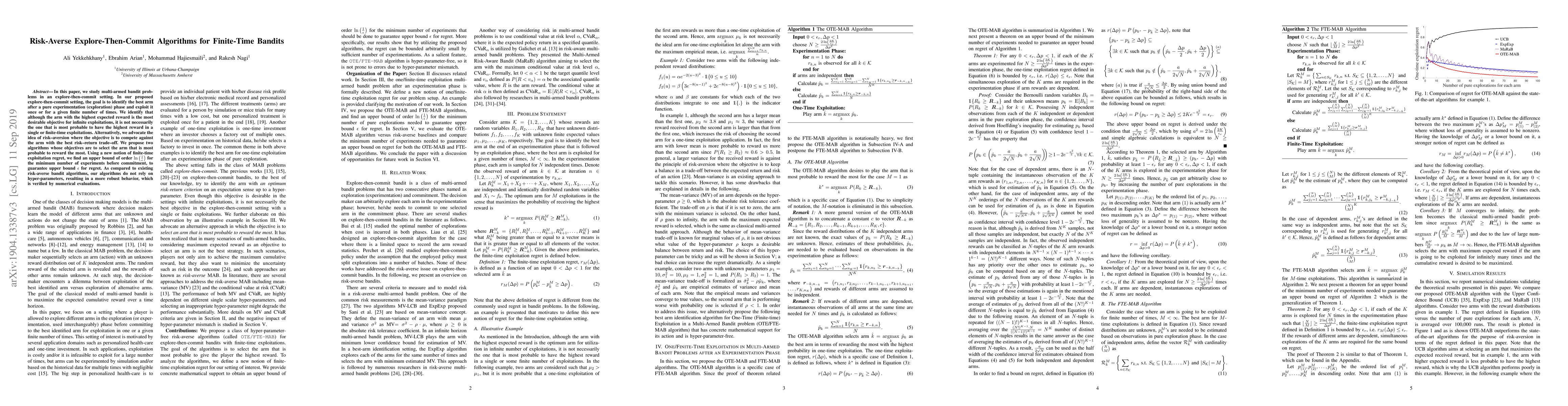 This paper proposes risk-averse explore-then-commit algorithms for finite-time multi-armed bandit problems, focusing on selecting the arm with the best risk-return trade-off. The algorithms aim to minimize finite-time exploitation regret without hyper-parameters, demonstrating robust performance in numerical evaluations.