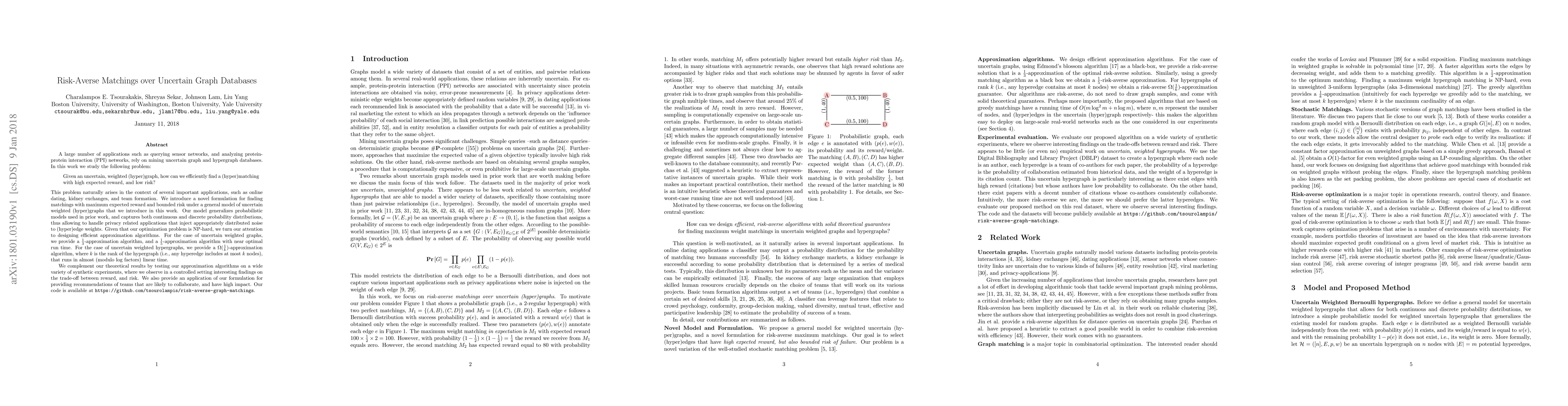 Researchers developed approximation algorithms to find matchings with high expected reward and low risk in uncertain graph databases, achieving near-optimal performance for certain cases.
