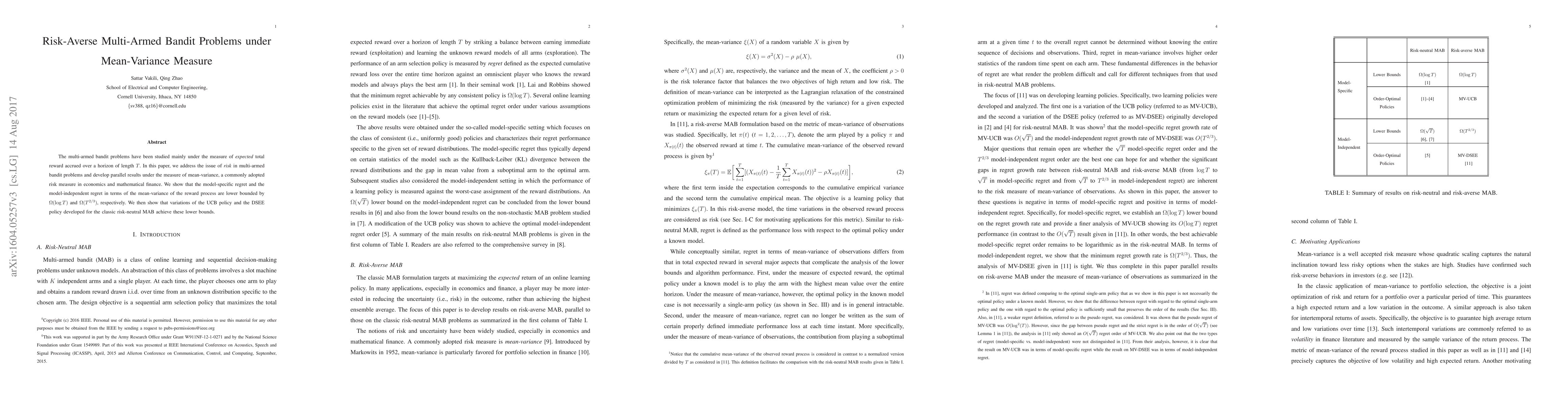 This paper explores risk-averse multi-armed bandit problems using the mean-variance measure, demonstrating lower bounds on model-specific and model-independent regret in $\Omega(\log T)$ and $\Omega(T^{2/3})$, respectively. It adapts the UCB and DSEE policies to achieve these bounds, extending classic risk-neutral bandit models into a risk-aware framework.