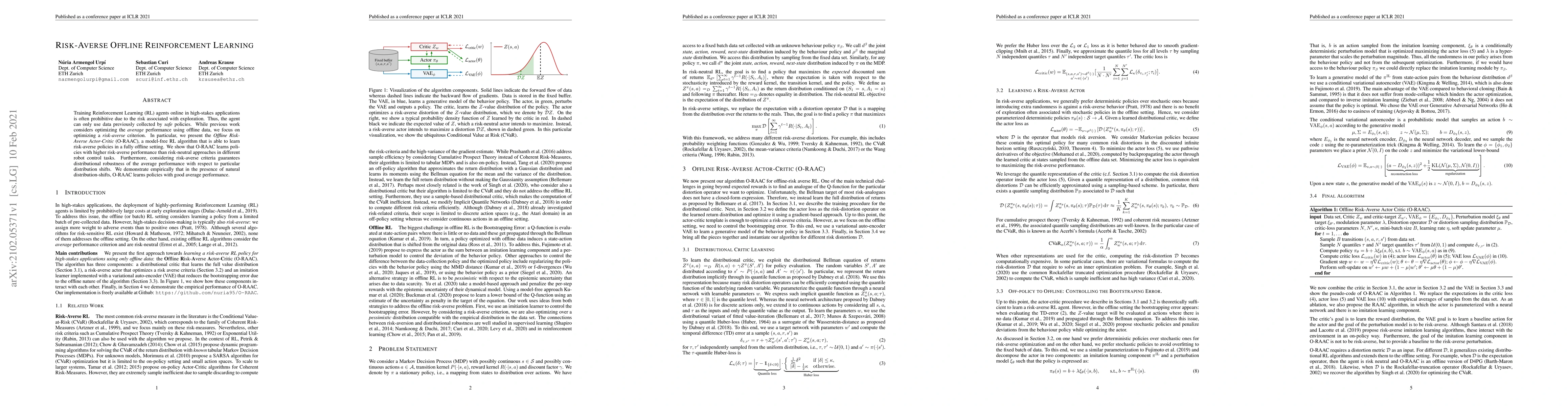 This paper introduces the Offline Risk-Averse Actor-Critic (O-RAAC) algorithm for training reinforcement learning agents using only previously collected safe data. It optimizes a risk-averse criterion, Conditional Value-at-Risk (CVaR), to ensure policies are robust to distribution shifts, demonstrating better performance in robot control tasks compared to risk-neutral approaches.