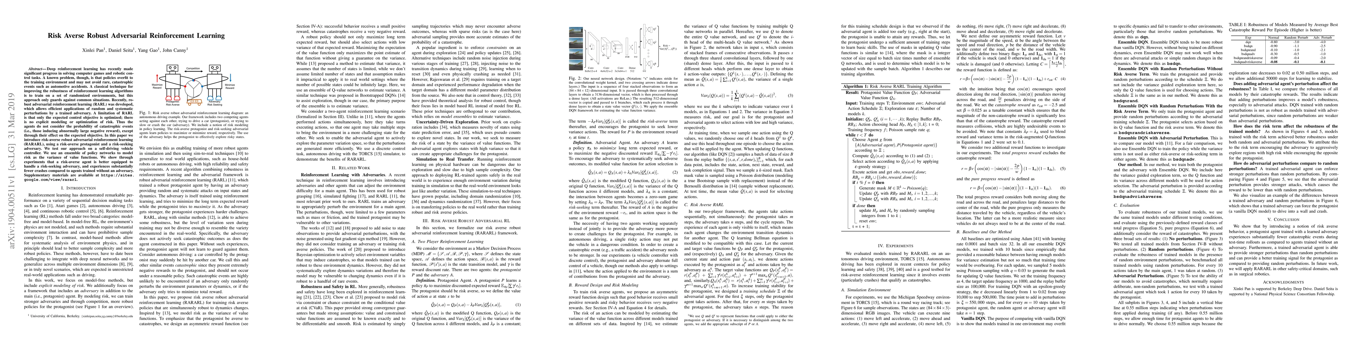 Deep reinforcement learning has recently made significant progress in solving computer games and robotic control tasks. A known problem, though, is that policies overfit to the training environment and may not avoid rare, catastrophic events such as automotive accidents. A classical technique for improving the robustness of reinforcement learning algorithms is to train on a set of randomized environments, but this approach only guards against common situations. Recently, robust adversarial reinforcement learning (RARL) was developed, which allows efficient applications of random and systematic perturbations by a trained adversary. A limitation of RARL is that only the expected control objective is optimized; there is no explicit modeling or optimization of risk. Thus the agents do not consider the probability of catastrophic events (i.e., those inducing abnormally large negative reward), except through their effect on the expected objective. In this paper we introduce risk-averse robust adversarial reinforcement learning (RARARL), using a risk-averse protagonist and a risk-seeking adversary. We test our approach on a self-driving vehicle controller. We use an ensemble of policy networks to model risk as the variance of value functions. We show through experiments that a risk-averse agent is better equipped to handle a risk-seeking adversary, and experiences substantially fewer crashes compared to agents trained without an adversary.