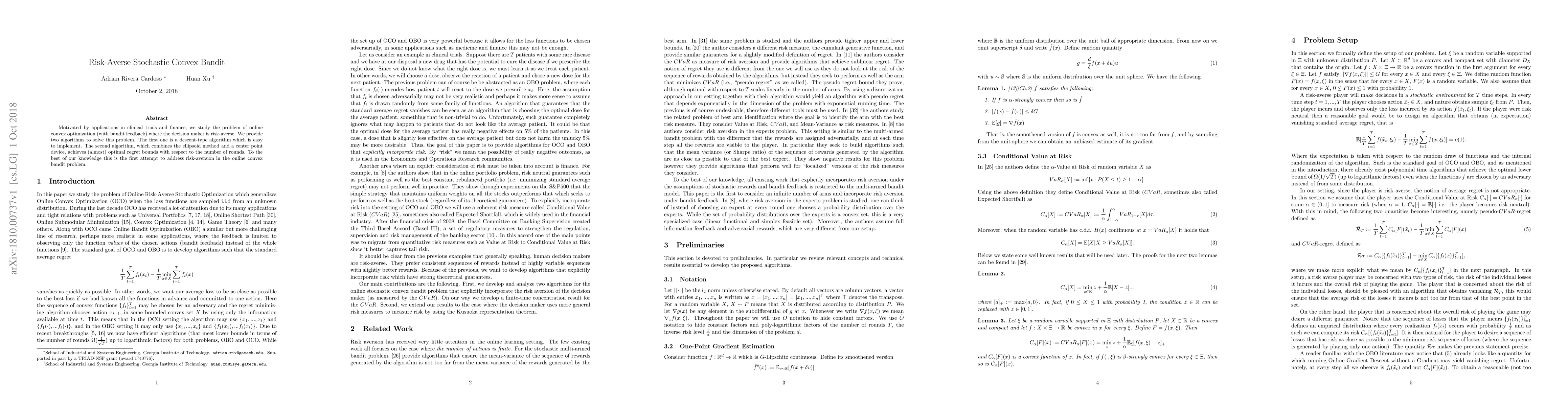 This paper introduces algorithms for risk-averse online convex optimization with bandit feedback, motivated by applications in clinical trials and finance. The study presents a simple descent-type algorithm and a more complex method combining the ellipsoid method and a center point device, achieving near-optimal regret bounds.