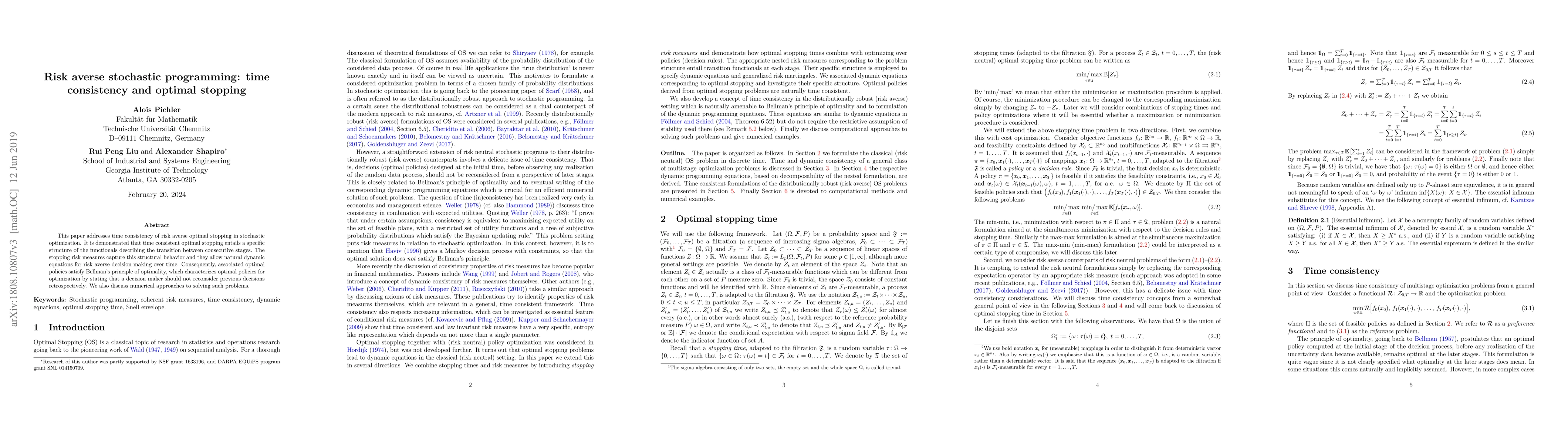 This paper explores time consistency in stochastic optimization, finding that risk measures often conflict with desirable properties, and introduces stopping time risk measures to address this issue. It aims to provide a framework for risk-averse decision-making by considering optimal stopping times.