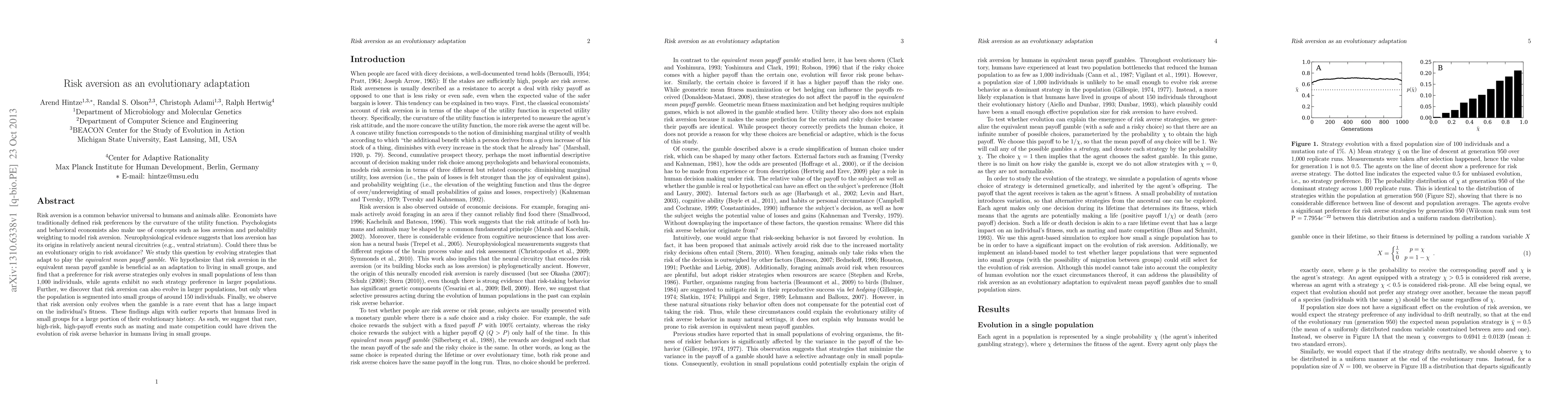 Risk aversion is a common behavior universal to humans and animals alike. Economists have traditionally defined risk preferences by the curvature of the utility function. Psychologists and behavioral economists also make use of concepts such as loss aversion and probability weighting to model risk aversion. Neurophysiological evidence suggests that loss aversion has its origins in relatively ancient neural circuitries (e.g., ventral striatum). Could there thus be an evolutionary origin to risk avoidance? We study this question by evolving strategies that adapt to play the equivalent mean payoff gamble. We hypothesize that risk aversion in the equivalent mean payoff gamble is beneficial as an adaptation to living in small groups, and find that a preference for risk averse strategies only evolves in small populations of less than 1,000 individuals, while agents exhibit no such strategy preference in larger populations. Further, we discover that risk aversion can also evolve in larger populations, but only when the population is segmented into small groups of around 150 individuals. Finally, we observe that risk aversion only evolves when the gamble is a rare event that has a large impact on the individual's fitness. These findings align with earlier reports that humans lived in small groups for a large portion of their evolutionary history. As such, we suggest that rare, high-risk, high-payoff events such as mating and mate competition could have driven the evolution of risk averse behavior in humans living in small groups.