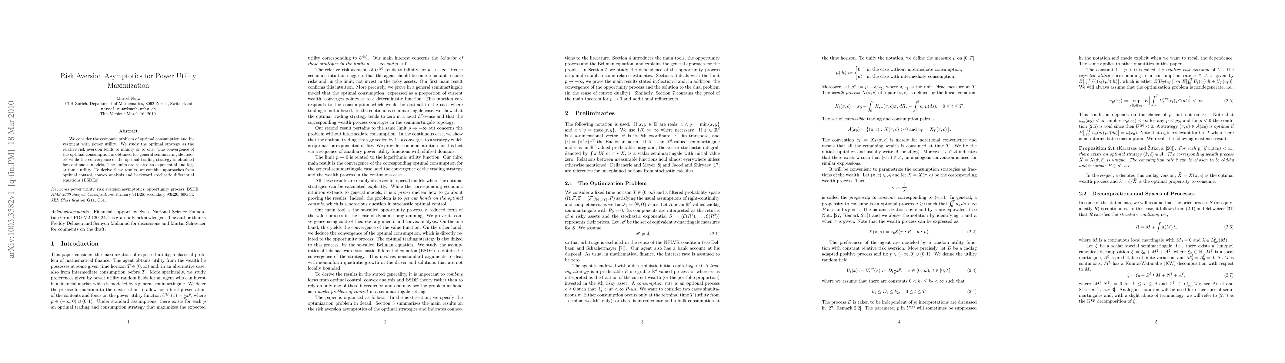 We consider the economic problem of optimal consumption and investment with power utility. We study the optimal strategy as the relative risk aversion tends to infinity or to one. The convergence of the optimal consumption is obtained for general semimartingale models while the convergence of the optimal trading strategy is obtained for continuous models. The limits are related to exponential and logarithmic utility. To derive these results, we combine approaches from optimal control, convex analysis and backward stochastic differential equations (BSDEs).