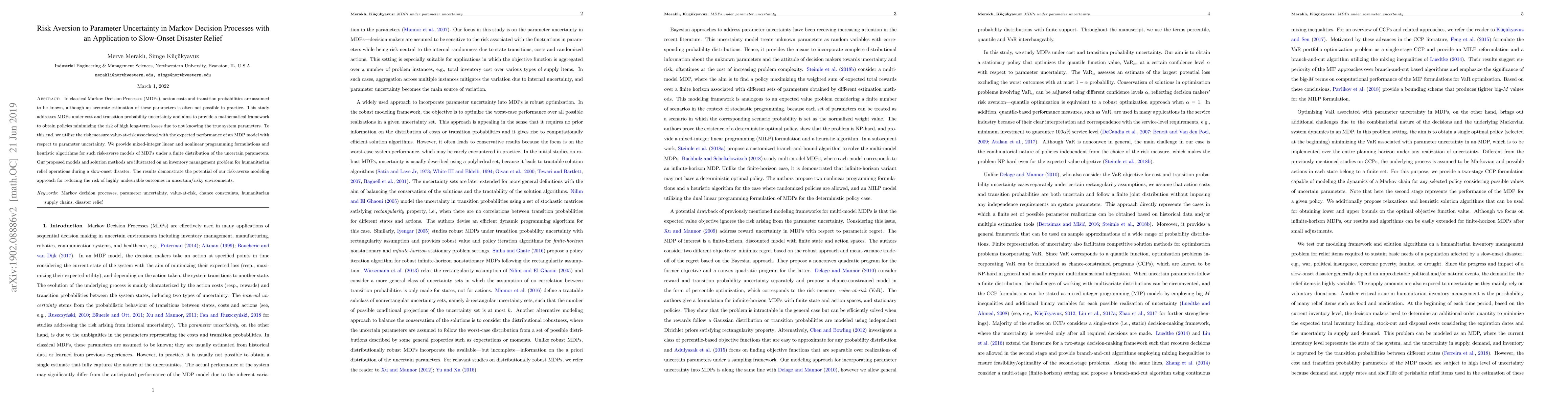 This paper develops a mathematical framework for risk-averse Markov Decision Processes (MDPs) under parameter uncertainty, using value-at-risk to minimize long-term losses due to unknown parameters. It applies the framework to an inventory management problem for disaster relief, showing its effectiveness in reducing risks in uncertain environments.