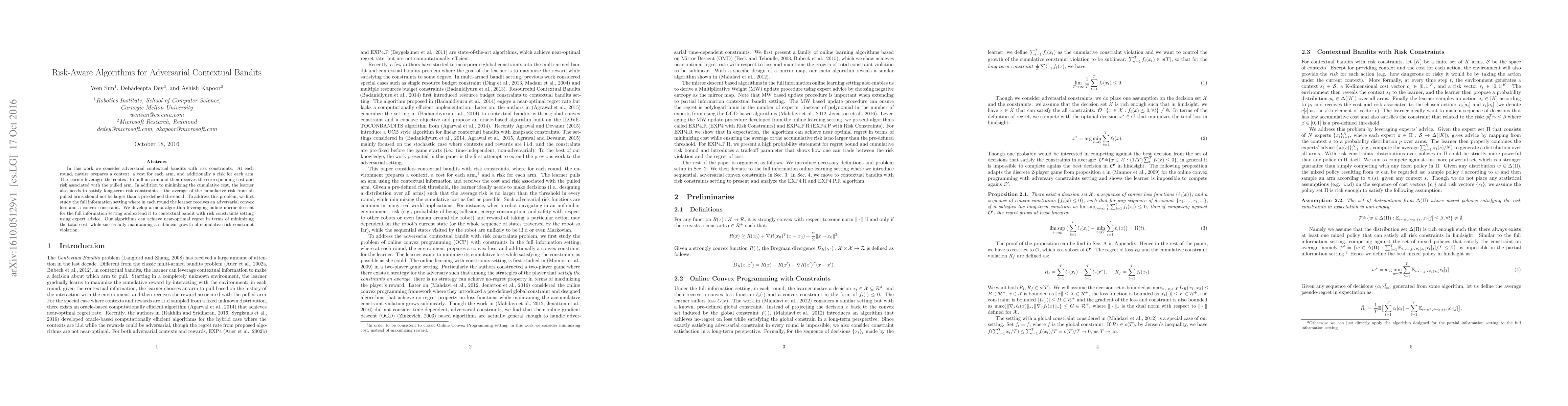 This paper proposes algorithms for adversarial contextual bandits that minimize cumulative costs while adhering to long-term risk constraints. It develops a meta algorithm using online mirror descent and expert advice, achieving near-optimal cost reduction and sublinear growth in risk violations.