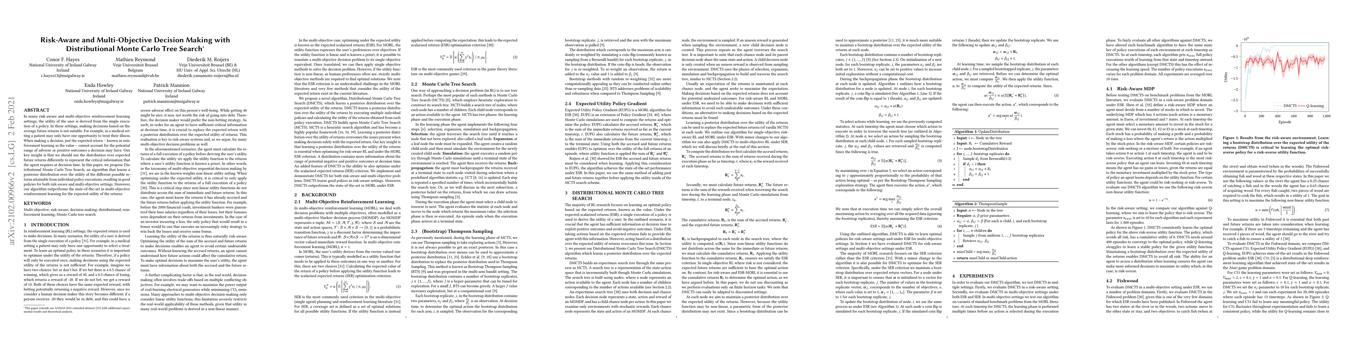 This paper proposes Distributional Monte Carlo Tree Search, an algorithm for risk-aware and multi-objective reinforcement learning that learns a distribution over expected future returns to better represent critical decision-making information. The algorithm outperforms existing state-of-the-art methods in multi-objective settings.