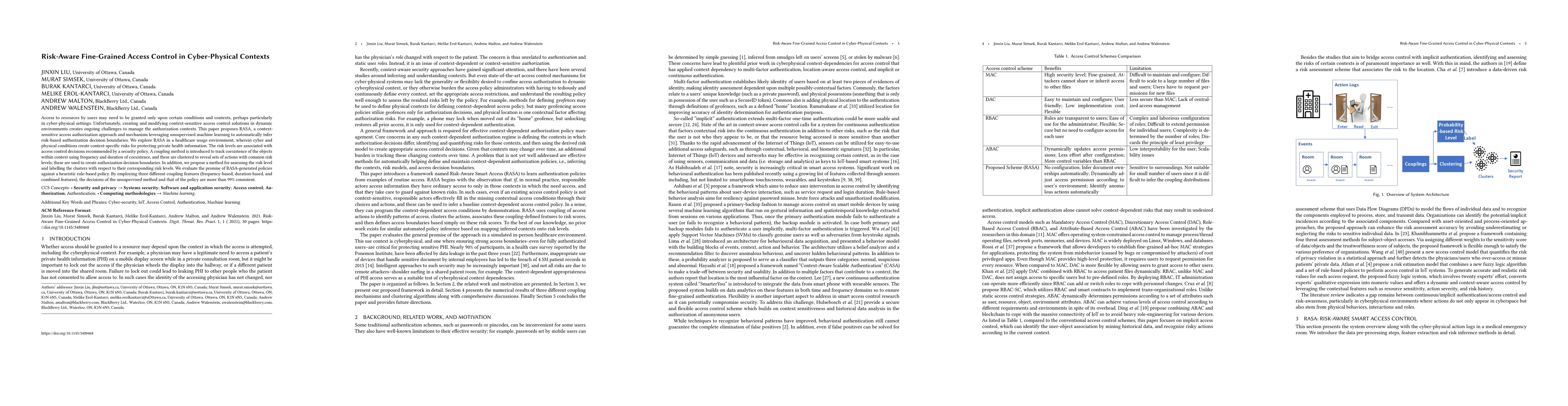Access to resources by users may need to be granted only upon certain conditions and contexts, perhaps particularly in cyber-physical settings. Unfortunately, creating and modifying context-sensitive access control solutions in dynamic environments creates ongoing challenges to manage the authorization contexts. This paper proposes RASA, a context-sensitive access authorization approach and mechanism leveraging unsupervised machine learning to automatically infer risk-based authorization decision boundaries. We explore RASA in a healthcare usage environment, wherein cyber and physical conditions create context-specific risks for protecting private health information. The risk levels are associated with access control decisions recommended by a security policy. A coupling method is introduced to track coexistence of the objects within context using frequency and duration of coexistence, and these are clustered to reveal sets of actions with common risk levels; these are used to create authorization decision boundaries. In addition, we propose a method for assessing the risk level and labelling the clusters with respect to their corresponding risk levels. We evaluate the promise of RASA-generated policies against a heuristic rule-based policy. By employing three different coupling features (frequency-based, duration-based, and combined features), the decisions of the unsupervised method and that of the policy are more than 99% consistent.