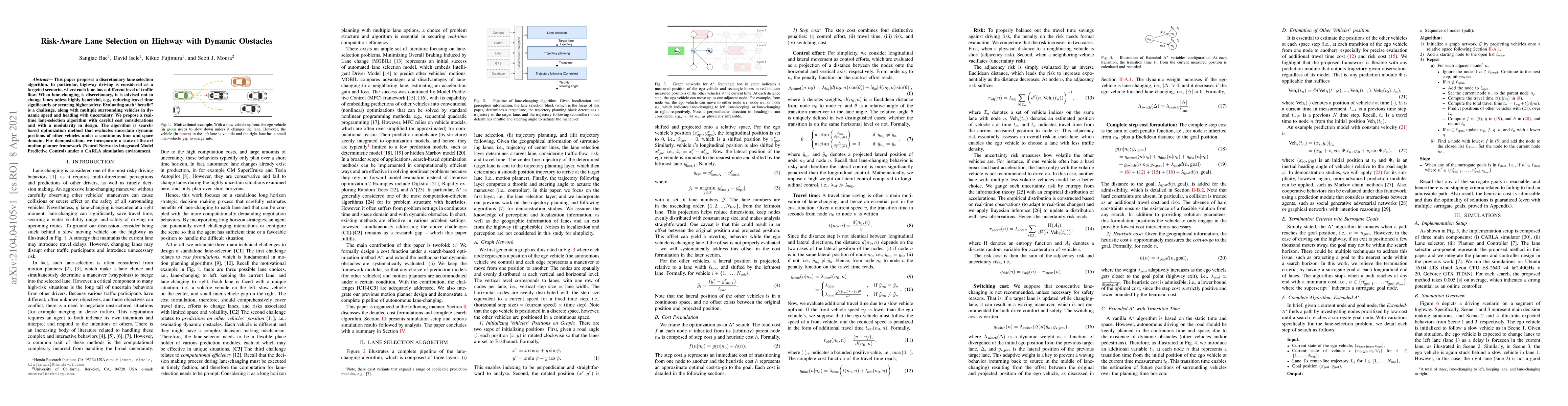 This paper introduces a discretionary lane selection algorithm for highway driving, emphasizing risk-aware decision-making under dynamic obstacle conditions. It employs a search-based optimization method to evaluate the uncertain positions of surrounding vehicles, integrating a state-of-the-art motion planner within a CARLA simulation environment.