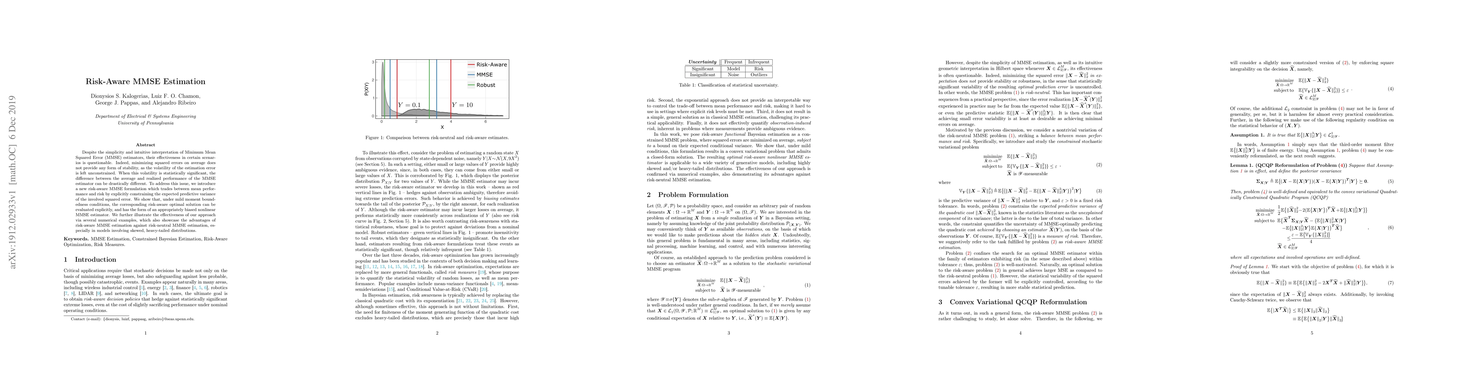 Despite the simplicity and intuitive interpretation of Minimum Mean Squared Error (MMSE) estimators, their effectiveness in certain scenarios is questionable. Indeed, minimizing squared errors on average does not provide any form of stability, as the volatility of the estimation error is left unconstrained. When this volatility is statistically significant, the difference between the average and realized performance of the MMSE estimator can be drastically different. To address this issue, we introduce a new risk-aware MMSE formulation which trades between mean performance and risk by explicitly constraining the expected predictive variance of the involved squared error. We show that, under mild moment boundedness conditions, the corresponding risk-aware optimal solution can be evaluated explicitly, and has the form of an appropriately biased nonlinear MMSE estimator. We further illustrate the effectiveness of our approach via several numerical examples, which also showcase the advantages of risk-aware MMSE estimation against risk-neutral MMSE estimation, especially in models involving skewed, heavy-tailed distributions.