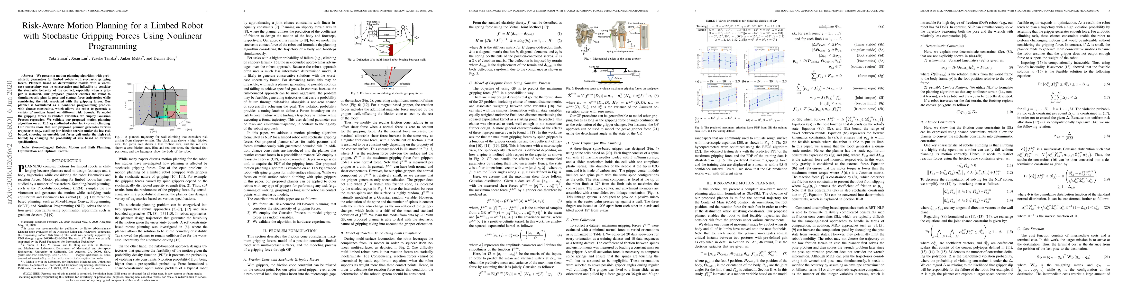 This paper proposes a risk-aware motion planning algorithm for limbed robots that considers stochastic gripping forces, formulated as a nonlinear programming problem with chance constraints. The planner generates diverse motion trajectories based on risk bounds, validated on a six-limbed robot for two-wall climbing.