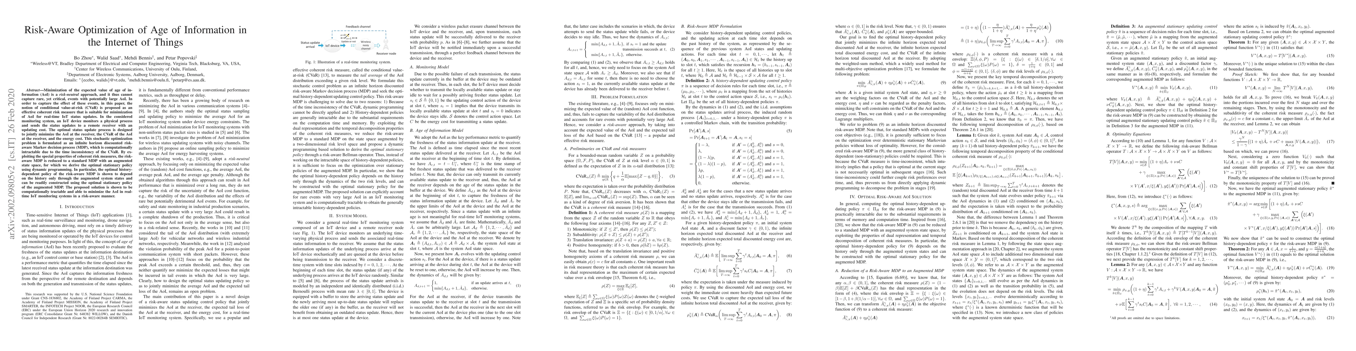 This paper proposes using conditional value-at-risk (CVaR) to minimize the age of information (AoI) in IoT systems, addressing rare critical events. It formulates the optimization problem as a risk-aware Markov decision process (MDP), which is solved using dynamic programming after transforming it into a standard MDP with an augmented state space. The solution is computationally tractable and effective for real-time IoT monitoring.