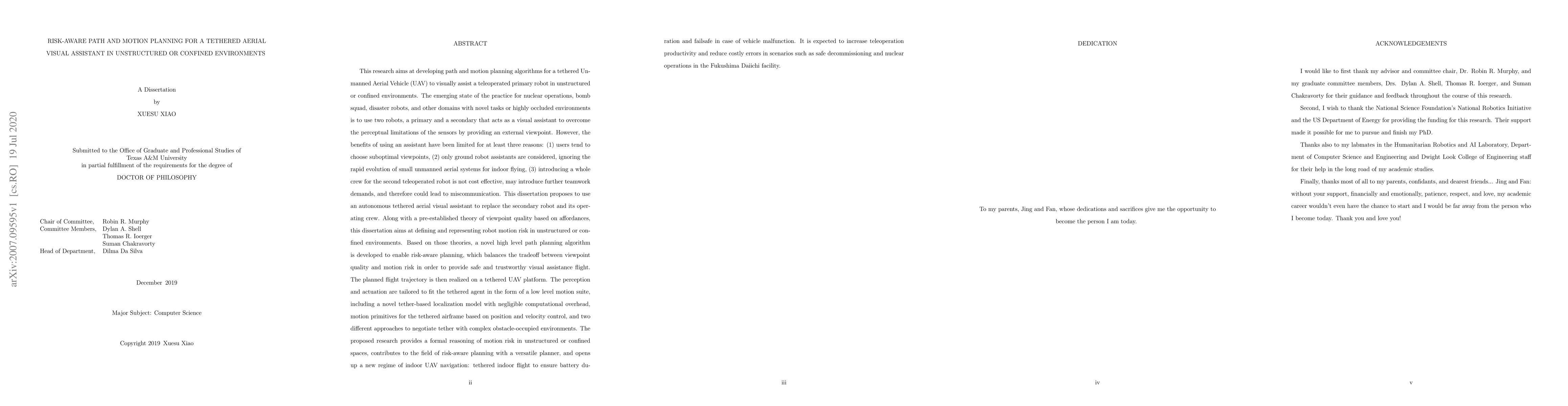 This research develops algorithms for a tethered aerial UAV to visually assist a primary robot in unstructured or confined environments, addressing issues of suboptimal viewpoints and motion risk. It proposes a novel high-level path planning algorithm balancing viewpoint quality and motion risk for safe visual assistance.