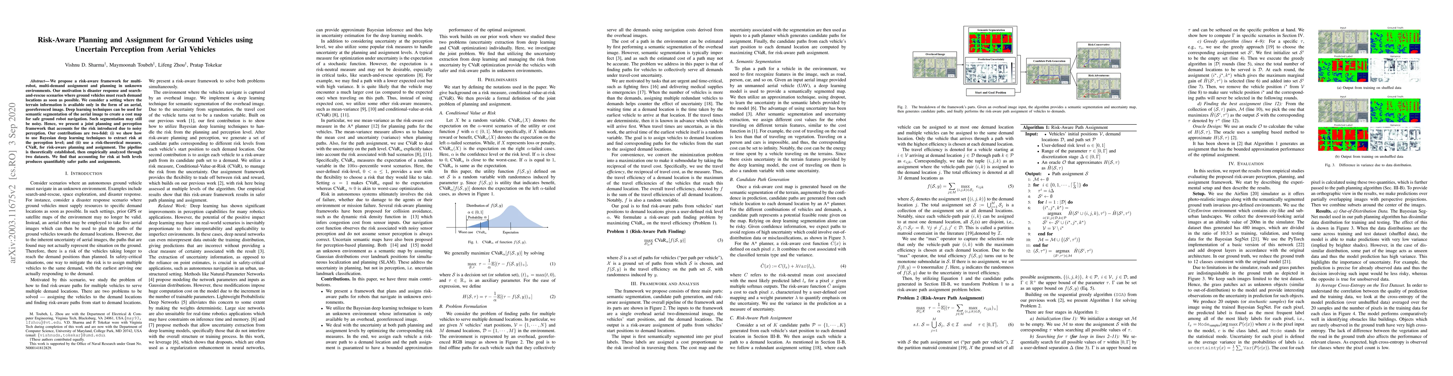 This paper proposes a risk-aware framework for multi-robot planning and assignment in unknown environments, using aerial imagery for terrain perception. It employs Bayesian deep learning for risk extraction and Conditional Value-at-Risk (CVaR) for planning, demonstrating safer navigation paths through empirical analysis.