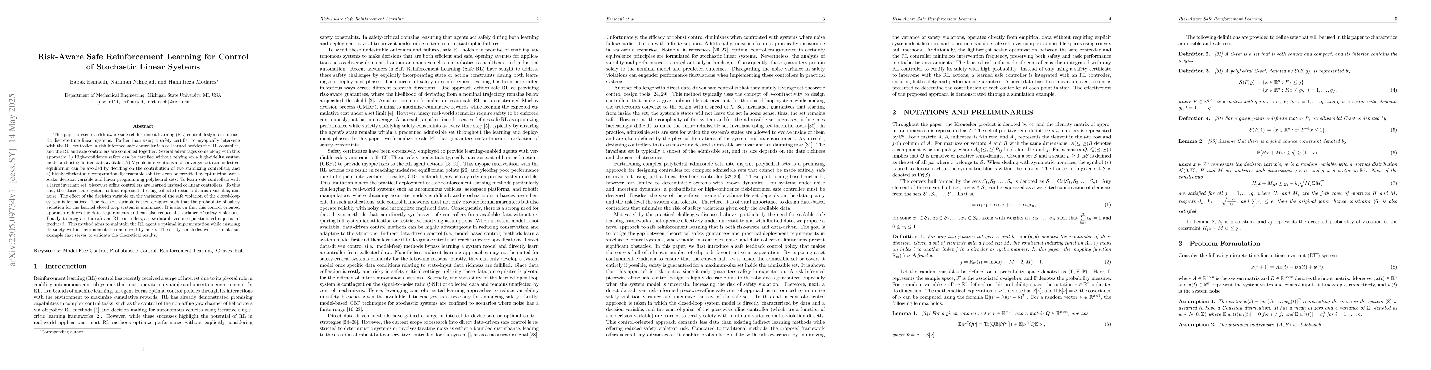This paper proposes a risk-aware safe reinforcement learning approach for controlling stochastic linear systems, combining an RL controller with a separate safe controller to ensure high-confidence safety.