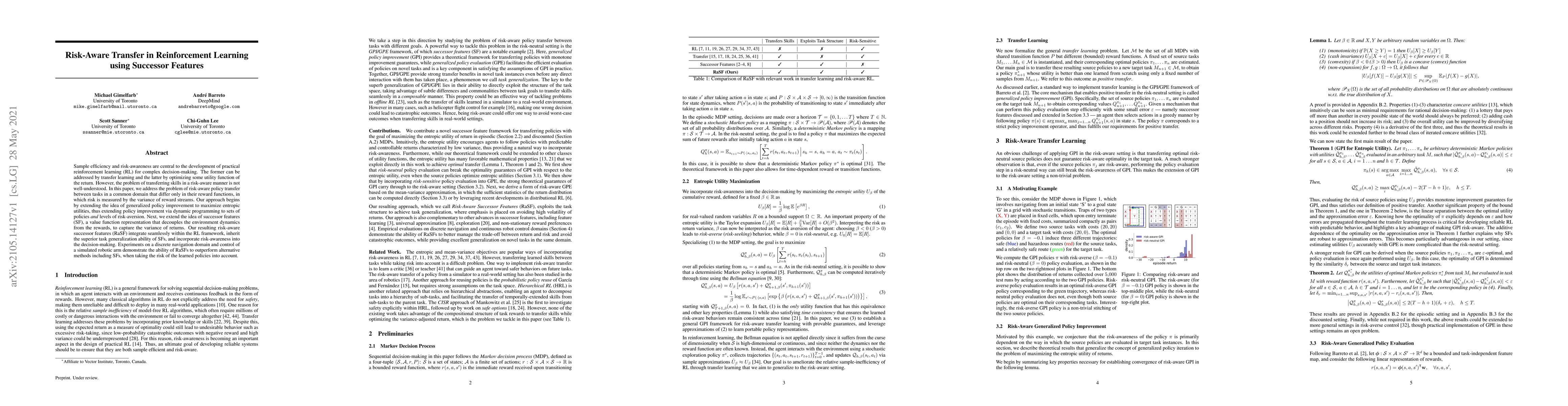 This paper proposes a method for risk-aware transfer learning in reinforcement learning using risk-aware successor features (RaSF). It extends generalized policy improvement to maximize entropic utilities and integrates risk-awareness into decision-making, demonstrating superior performance over alternative methods in navigation and robotic control tasks.
