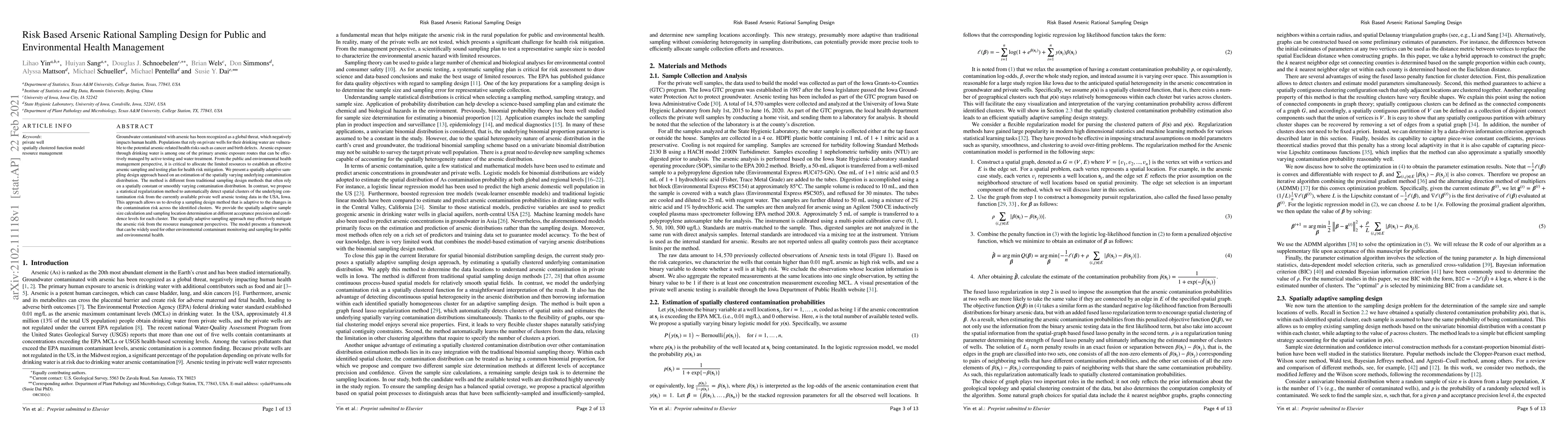 Groundwater contaminated with arsenic has been recognized as a global threat, which negatively impacts human health. Populations that rely on private wells for their drinking water are vulnerable to the potential arsenic-related health risks such as cancer and birth defects. Arsenic exposure through drinking water is among one of the primary arsenic exposure routes that can be effectively managed by active testing and water treatment. From the public and environmental health management perspective, it is critical to allocate the limited resources to establish an effective arsenic sampling and testing plan for health risk mitigation. We present a spatially adaptive sampling design approach based on an estimation of the spatially varying underlying contamination distribution. The method is different from traditional sampling design methods that often rely on a spatially constant or smoothly varying contamination distribution. In contrast, we propose a statistical regularization method to automatically detect spatial clusters of the underlying contamination risk from the currently available private well arsenic testing data in the USA, Iowa. This approach allows us to develop a sampling design method that is adaptive to the changes in the contamination risk across the identified clusters. We provide the spatially adaptive sample size calculation and sampling location determination at different acceptance precision and confidence levels for each cluster. The spatially adaptive sampling approach may effectively mitigate the arsenic risk from the resource management perspectives. The model presents a framework that can be widely used for other environmental contaminant monitoring and sampling for public and environmental health.