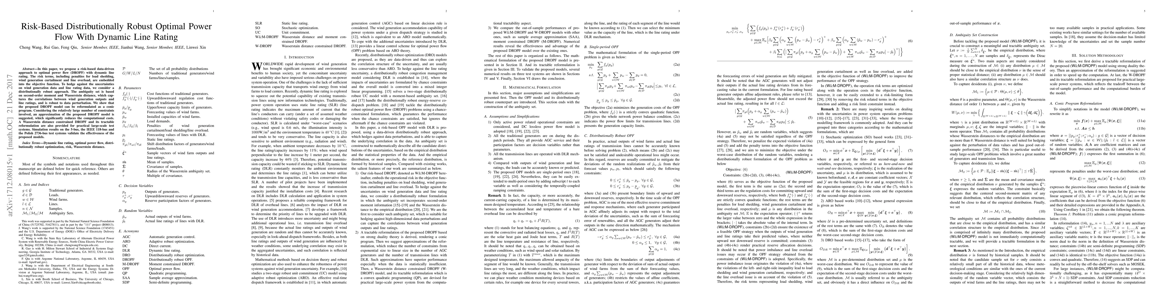 A new approach to optimizing power flow with dynamic line rating is proposed, incorporating risk terms for load shedding, wind generation curtailment, and line overload into a distributionally robust model.