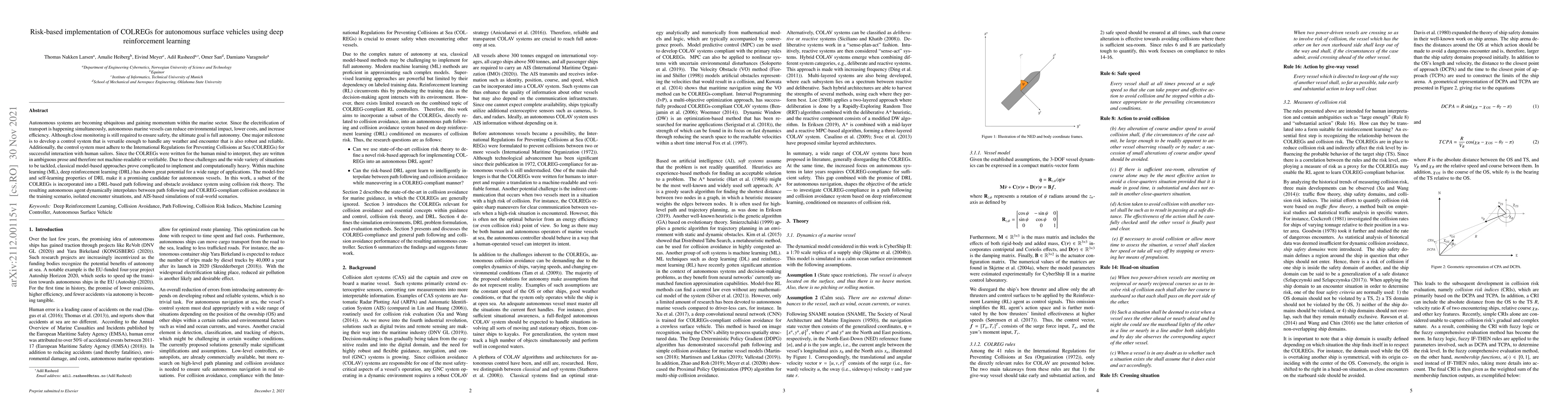 This paper explores the application of deep reinforcement learning (DRL) to implement a risk-based control system for autonomous surface vehicles that adheres to the International Regulations for Preventing Collisions at Sea (COLREGs). The DRL-based system dynamically balances path following and collision avoidance, demonstrating compliance with COLREGs in various scenarios.