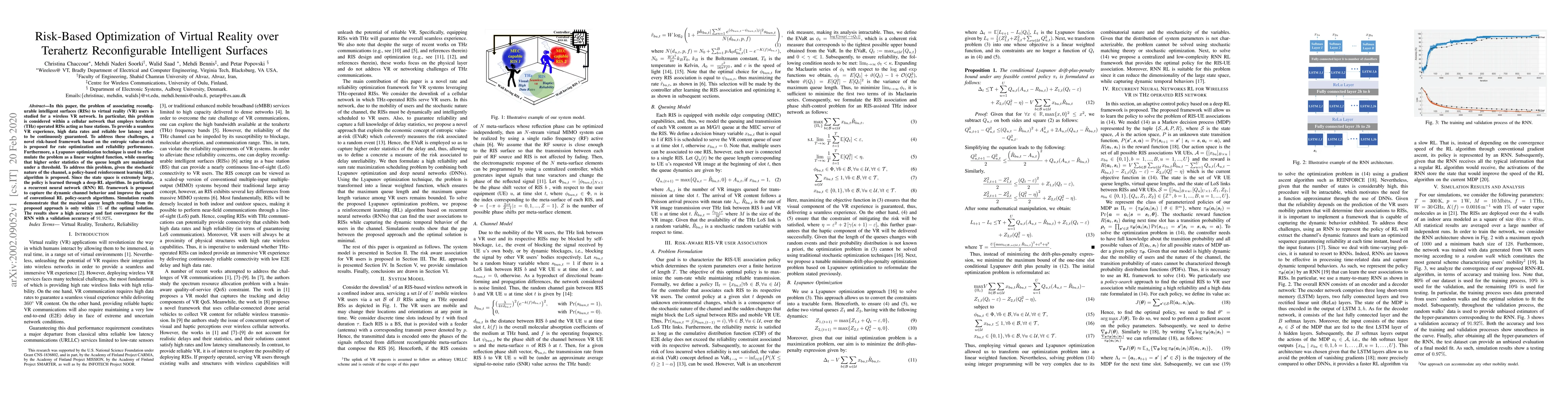 In this paper, the problem of associating reconfigurable intelligent surfaces (RISs) to virtual reality (VR) users is studied for a wireless VR network. In particular, this problem is considered within a cellular network that employs terahertz (THz) operated RISs acting as base stations. To provide a seamless VR experience, high data rates and reliable low latency need to be continuously guaranteed. To address these challenges, a novel risk-based framework based on the entropic value-at-risk is proposed for rate optimization and reliability performance. Furthermore, a Lyapunov optimization technique is used to reformulate the problem as a linear weighted function, while ensuring that higher order statistics of the queue length are maintained under a threshold. To address this problem, given the stochastic nature of the channel, a policy-based reinforcement learning (RL) algorithm is proposed. Since the state space is extremely large, the policy is learned through a deep-RL algorithm. In particular, a recurrent neural network (RNN) RL framework is proposed to capture the dynamic channel behavior and improve the speed of conventional RL policy-search algorithms. Simulation results demonstrate that the maximal queue length resulting from the proposed approach is only within 1% of the optimal solution. The results show a high accuracy and fast convergence for the RNN with a validation accuracy of 91.92%.