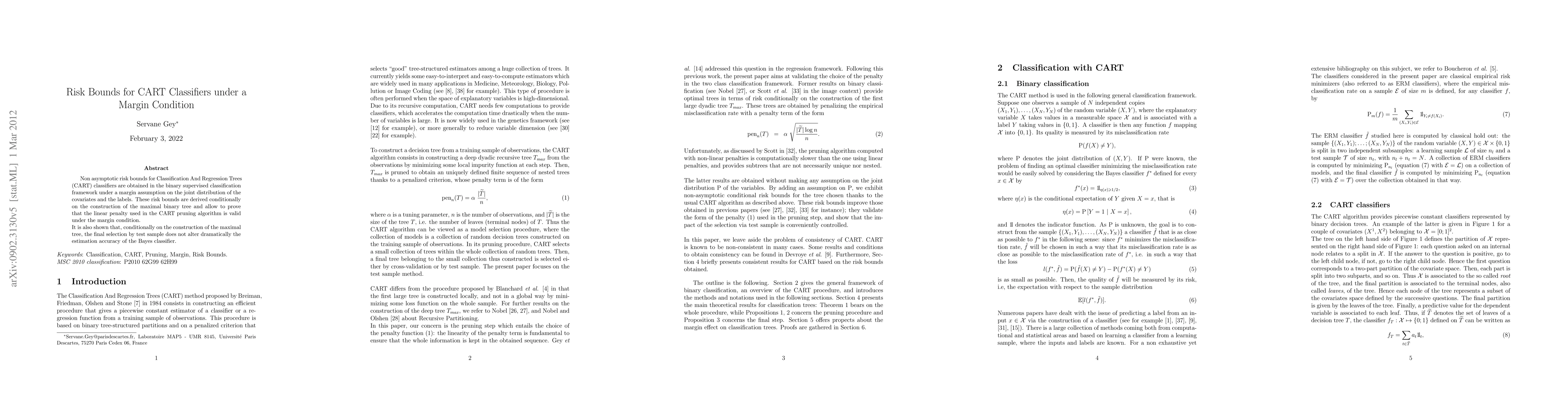 This paper provides risk bounds for CART classifiers under a margin condition in binary classification, demonstrating the validity of the CART pruning algorithm and showing that test sample selection does not significantly impact estimation accuracy compared to the Bayes classifier. The findings validate the CART algorithm for data mining applications in fields like Biology, Medicine, and Image Coding.