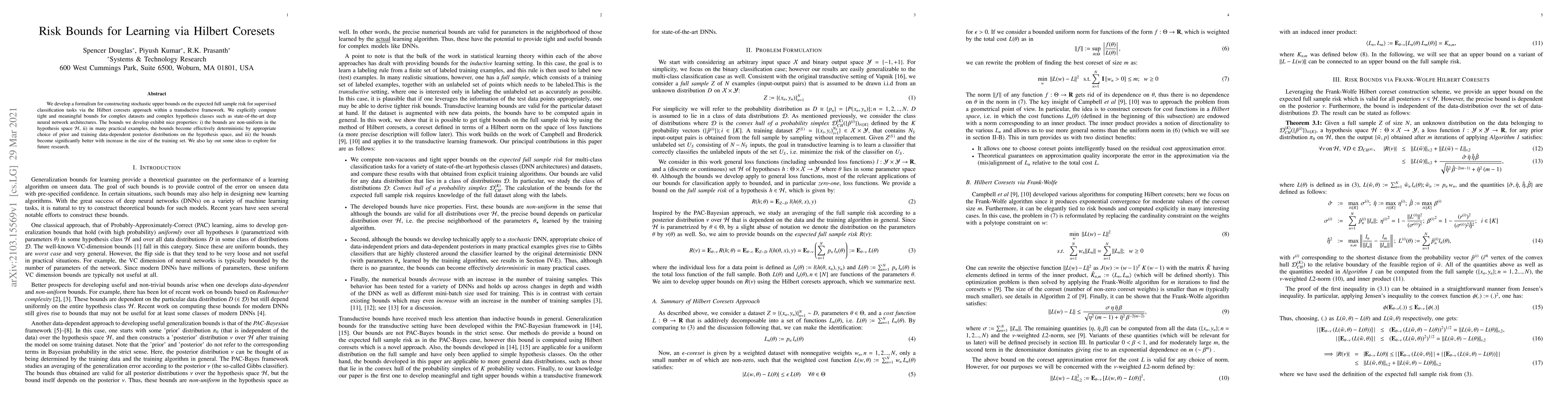 We develop a formalism for constructing stochastic upper bounds on the expected full sample risk for supervised classification tasks via the Hilbert coresets approach within a transductive framework. We explicitly compute tight and meaningful bounds for complex datasets and complex hypothesis classes such as state-of-the-art deep neural network architectures. The bounds we develop exhibit nice properties: i) the bounds are non-uniform in the hypothesis space, ii) in many practical examples, the bounds become effectively deterministic by appropriate choice of prior and training data-dependent posterior distributions on the hypothesis space, and iii) the bounds become significantly better with increase in the size of the training set. We also lay out some ideas to explore for future research.