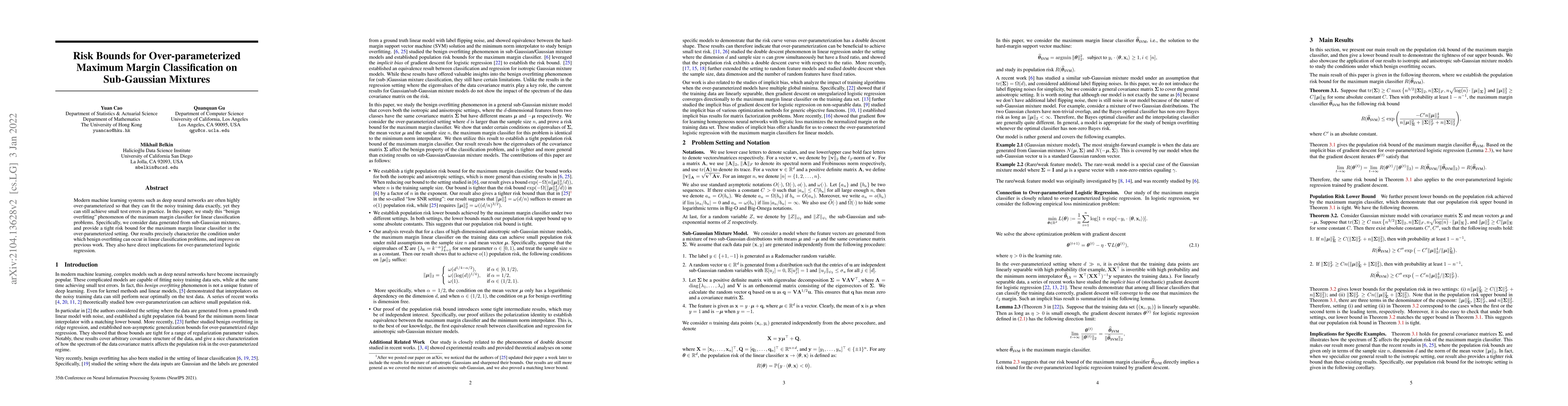 Modern machine learning systems such as deep neural networks are often highly over-parameterized so that they can fit the noisy training data exactly, yet they can still achieve small test errors in practice. In this paper, we study this "benign overfitting" phenomenon of the maximum margin classifier for linear classification problems. Specifically, we consider data generated from sub-Gaussian mixtures, and provide a tight risk bound for the maximum margin linear classifier in the over-parameterized setting. Our results precisely characterize the condition under which benign overfitting can occur in linear classification problems, and improve on previous work. They also have direct implications for over-parameterized logistic regression.