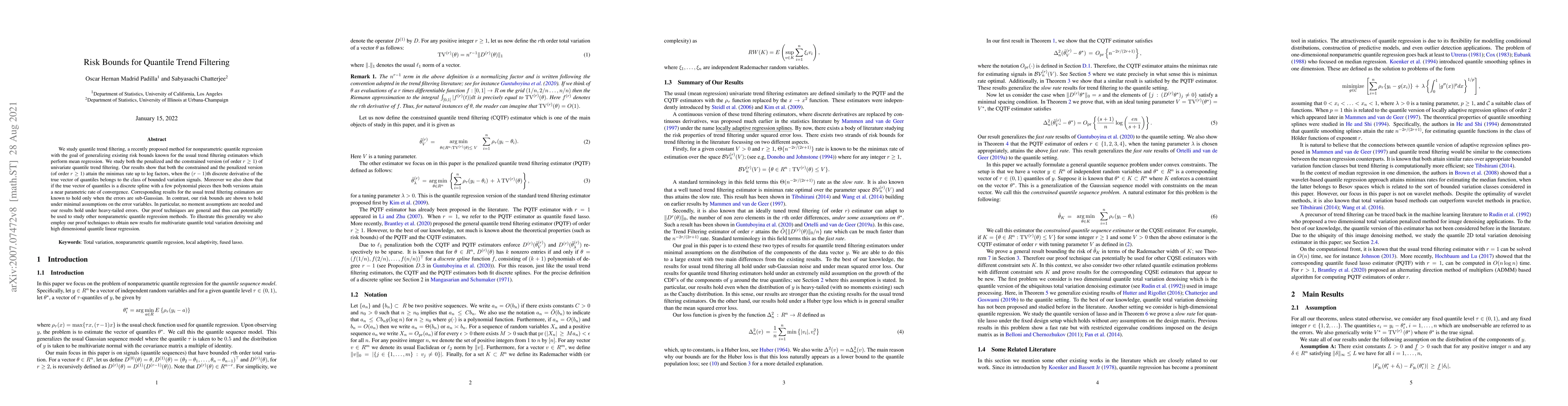 This paper establishes risk bounds for penalized and constrained quantile trend filtering, showing they achieve minimax rates under minimal assumptions on error distributions, including heavy-tailed errors. The methods generalize existing trend filtering results, which require sub-Gaussian errors.
