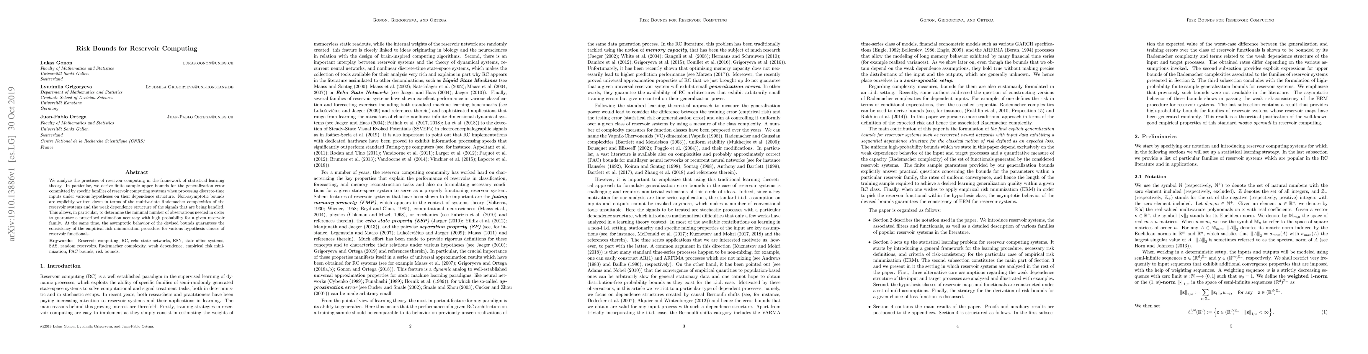 We analyze the practices of reservoir computing in the framework of statistical learning theory. In particular, we derive finite sample upper bounds for the generalization error committed by specific families of reservoir computing systems when processing discrete-time inputs under various hypotheses on their dependence structure. Non-asymptotic bounds are explicitly written down in terms of the multivariate Rademacher complexities of the reservoir systems and the weak dependence structure of the signals that are being handled. This allows, in particular, to determine the minimal number of observations needed in order to guarantee a prescribed estimation accuracy with high probability for a given reservoir family. At the same time, the asymptotic behavior of the devised bounds guarantees the consistency of the empirical risk minimization procedure for various hypothesis classes of reservoir functionals.