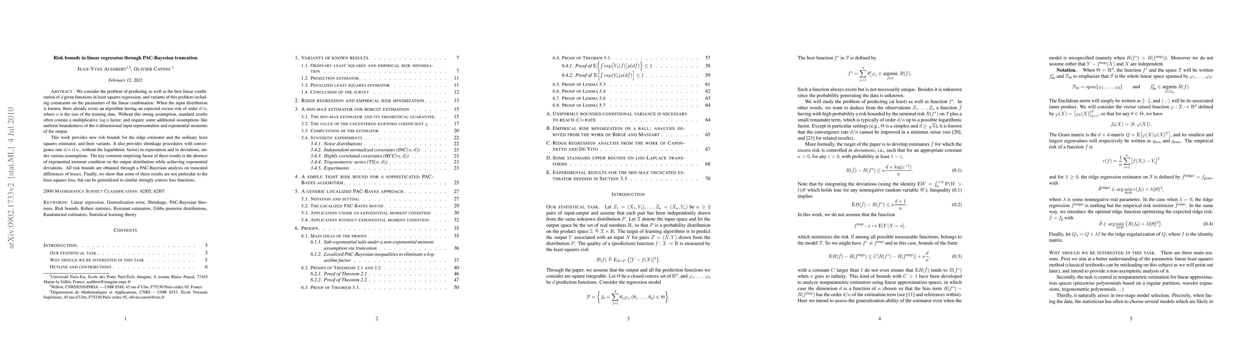 This paper presents new risk bounds for linear regression estimators using PAC-Bayesian truncation, achieving convergence rates of d/n without the usual log n factor, and without requiring exponential moments on the output distribution. The results apply to ridge and ordinary least squares estimators and generalize to other strongly convex losses.