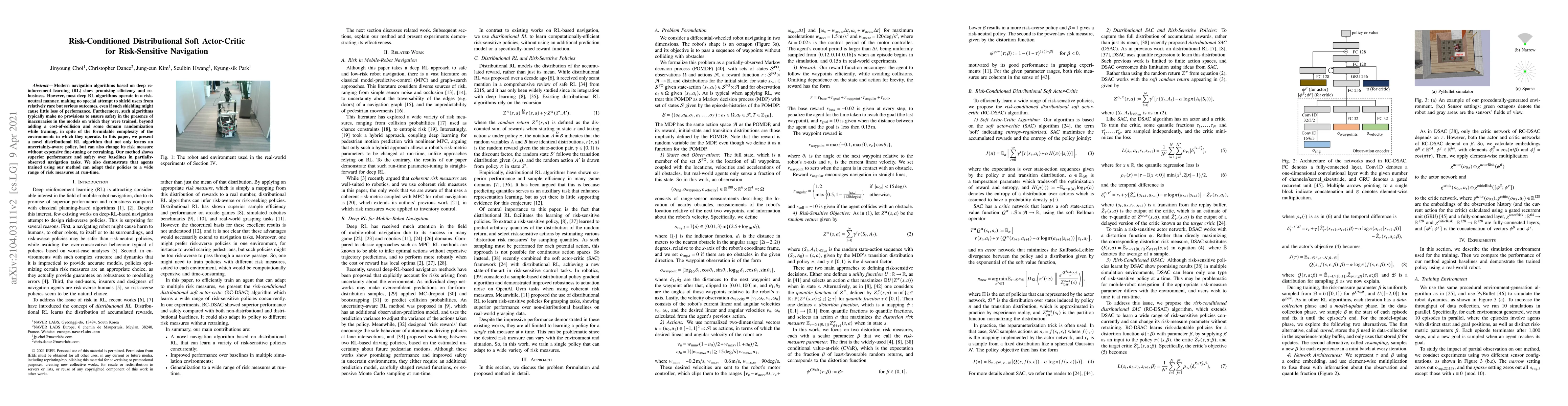 This paper introduces a novel risk-conditioned distributional soft actor-critic algorithm for navigation that learns an uncertainty-aware policy and adapts its risk measure dynamically without retraining. The method demonstrates superior performance and safety compared to baselines in partially-observed navigation tasks.