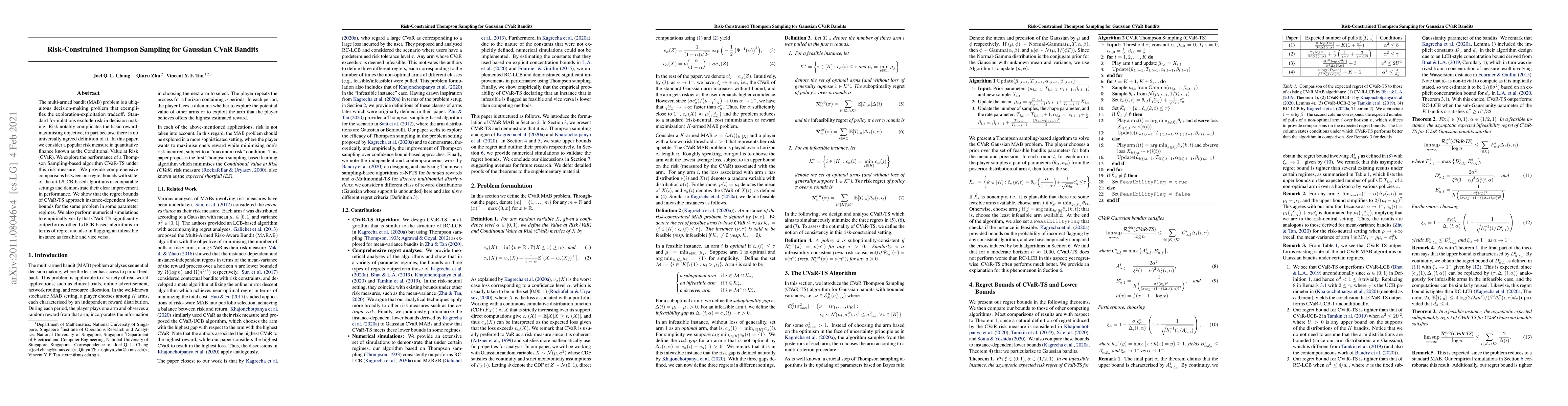 This paper proposes a new algorithm, CVaR-TS, that combines Thompson Sampling with Conditional Value at Risk to improve performance in the multi-armed bandit problem, outperforming existing L/UCB-based algorithms.