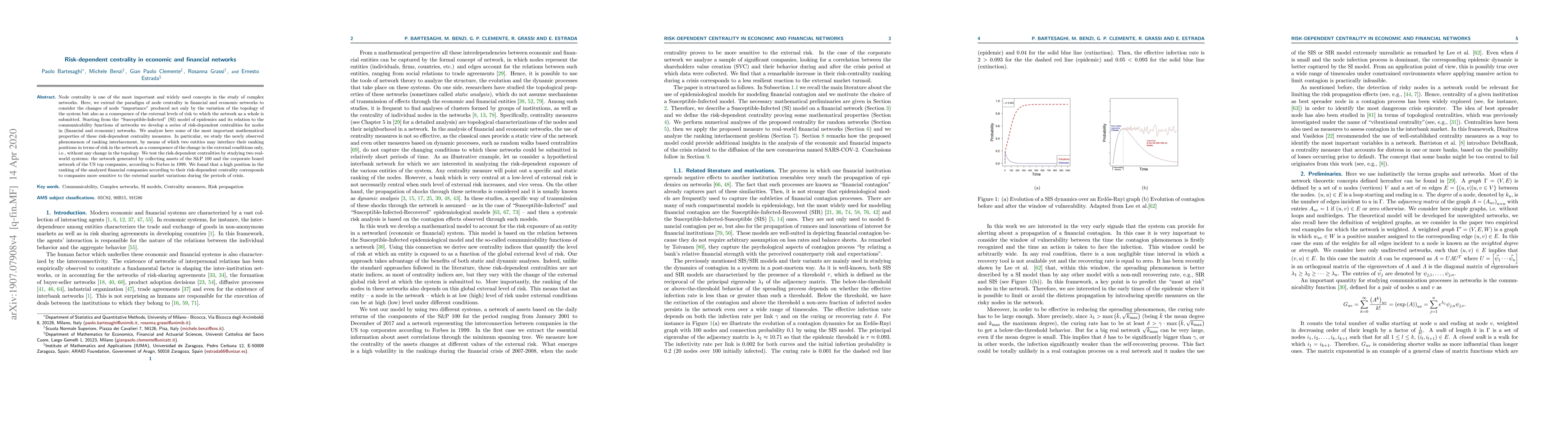 Node centrality is one of the most important and widely used concepts in the study of complex networks. Here, we extend the paradigm of node centrality in financial and economic networks to consider the changes of node "importance" produced not only by the variation of the topology of the system but also as a consequence of the external levels of risk to which the network as a whole is submitted. Starting from the "Susceptible-Infected" (SI) model of epidemics and its relation to the communicability functions of networks we develop a series of risk-dependent centralities for nodes in (financial and economic) networks. We analyze here some of the most important mathematical properties of these risk-dependent centrality measures. In particular, we study the newly observed phenomenon of ranking interlacement, by means of which two entities may interlace their ranking positions in terms of risk in the network as a consequence of the change in the external conditions only, i.e., without any change in the topology. We test the risk-dependent centralities by studying two real-world systems: the network generated by collecting assets of the S\&P 100 and the corporate board network of the US top companies, according to Forbes in 1999. We found that a high position in the ranking of the analyzed financial companies according to their risk-dependent centrality corresponds to companies more sensitive to the external market variations during the periods of crisis.