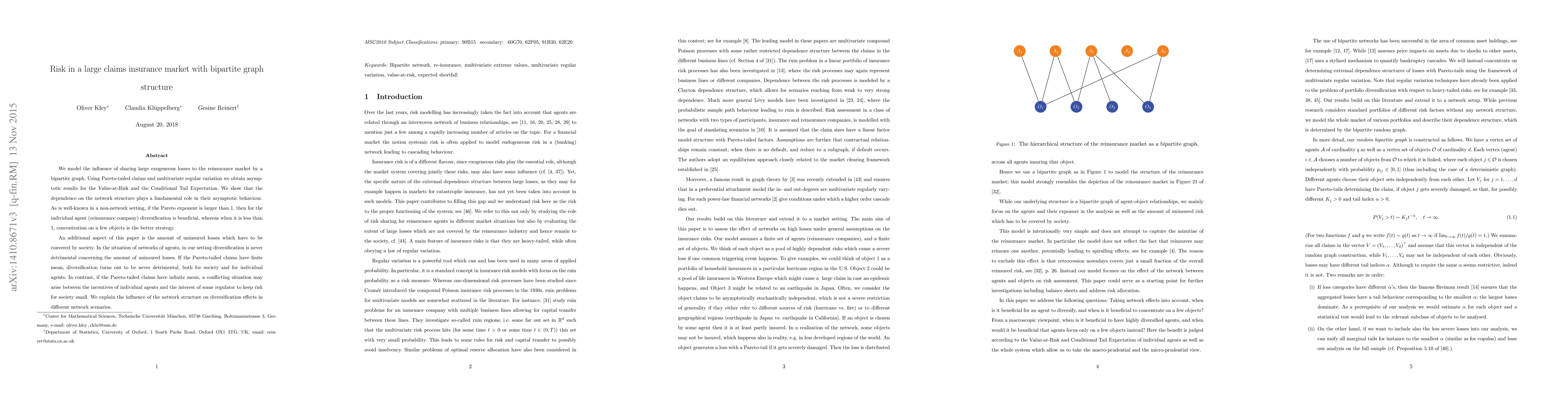 We model the influence of sharing large exogeneous losses to the reinsurance market by a bipartite graph. Using Pareto-tailed claims and multivariate regular variation we obtain asymptotic results for the Value-at-Risk and the Conditional Tail Expectation. We show that the dependence on the network structure plays a fundamental role in their asymptotic behaviour. As is well-known in a non-network setting, if the Pareto exponent is larger than 1, then for the individual agent (reinsurance company) diversification is beneficial, whereas when it is less than 1, concentration on a few objects is the better strategy. An additional aspect of this paper is the amount of uninsured losses which have to be convered by society. In the situation of networks of agents, in our setting diversification is never detrimental concerning the amount of uninsured losses. If the Pareto-tailed claims have finite mean, diversification turns out to be never detrimental, both for society and for individual agents. In contrast, if the Pareto-tailed claims have infinite mean, a conflicting situation may arise between the incentives of individual agents and the interest of some regulator to keep risk for society small. We explain the influence of the network structure on diversification effects in different network scenarios.