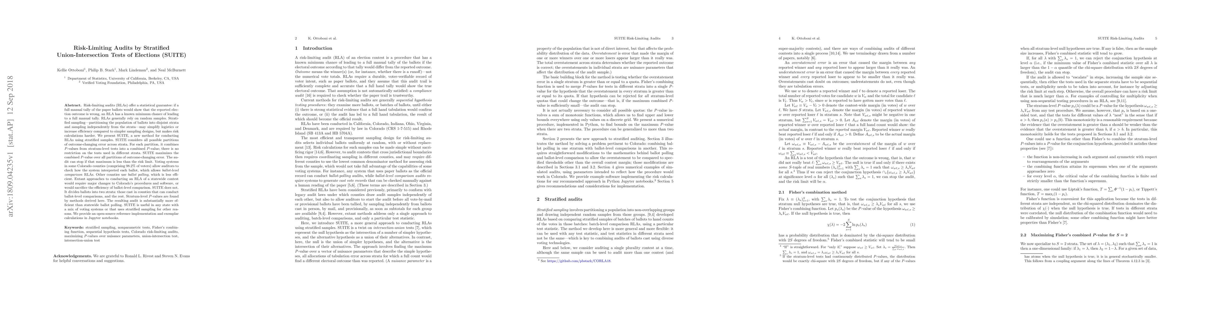 Risk-limiting audits (RLAs) offer a statistical guarantee: if a full manual tally of the paper ballots would show that the reported election outcome is wrong, an RLA has a known minimum chance of leading to a full manual tally. RLAs generally rely on random samples. Stratified sampling--partitioning the population of ballots into disjoint strata and sampling independently from the strata--may simplify logistics or increase efficiency compared to simpler sampling designs, but makes risk calculations harder. We present SUITE, a new method for conducting RLAs using stratified samples. SUITE considers all possible partitions of outcome-changing error across strata. For each partition, it combines P-values from stratum-level tests into a combined P-value; there is no restriction on the tests used in different strata. SUITE maximizes the combined P-value over all partitions of outcome-changing error. The audit can stop if that maximum is less than the risk limit. Voting systems in some Colorado counties (comprising 98.2% of voters) allow auditors to check how the system interpreted each ballot, which allows ballot-level comparison RLAs. Other counties use ballot polling, which is less efficient. Extant approaches to conducting an RLA of a statewide contest would require major changes to Colorado's procedures and software, or would sacrifice the efficiency of ballot-level comparison. SUITE does not. It divides ballots into two strata: those cast in counties that can conduct ballot-level comparisons, and the rest. Stratum-level P-values are found by methods derived here. The resulting audit is substantially more efficient than statewide ballot polling. SUITE is useful in any state with a mix of voting systems or that uses stratified sampling for other reasons. We provide an open-source reference implementation and exemplar calculations in Jupyter notebooks.